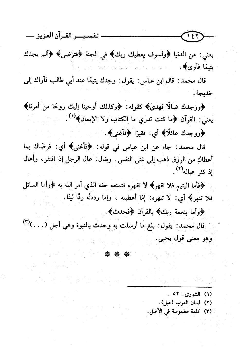 قَالَ مُحَمَّد: جَاءَ عَنِ ابْن عَبَّاس فِي قَوْله: {فأغنى} أَيْ: فَرَضَّاكَ بِمَا أَعْطَاكَ مِنَ الرِّزْقِ ذَهَبَ إِلَى غِنَى النَّفْسِ. وَيُقَالُ: عَالَ الرَّجُلُ إِذَا افْتَقَرَ، وأعال إِذْ كثر عِيَاله.