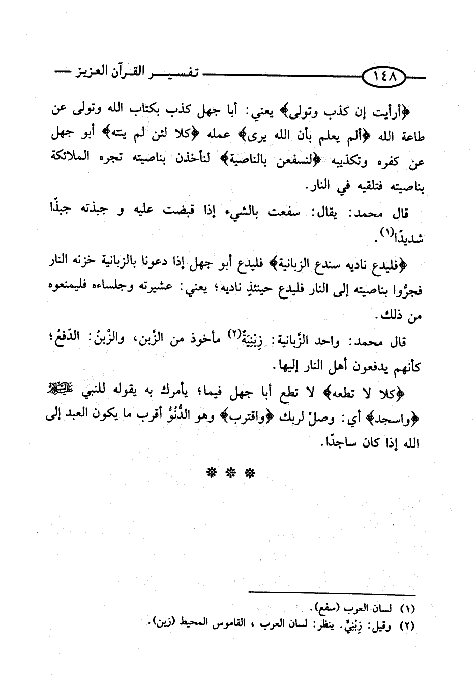 قَالَ مُحَمَّدٌ: يُقَالُ: سَفَعَتَ بِالشَّيْءِ إِذَا قَبَضْتَ عَلَيْهِ وجبذته جبذاً شَدِيدا.