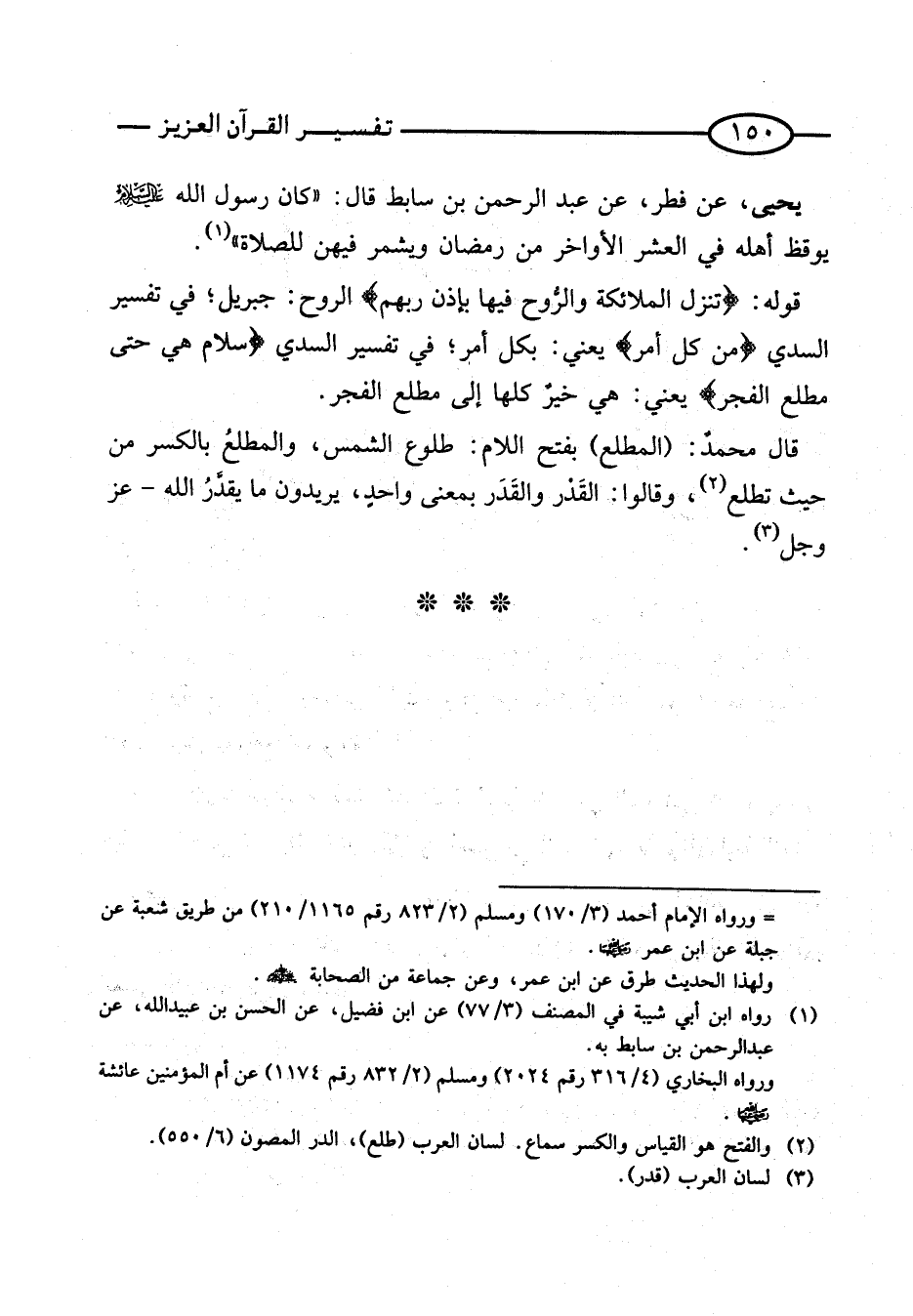 يَحْيَى، عَنْ فِطْرٍ، عَنْ عَبْدِ الرَّحْمَنِ بْنِ سَابِطٍ قَالَ: ((كَانَ رَسُولَ اللَّهِ صَلَّى اللَّهُ عَلَيْهِ وَسلم يُوقِظُ أَهْلَهُ فِي الْعَشْرِ الْأَوَاخِرِ مِنْ رَمَضَانَ وَيُشَمِّرُ فِيهِنَّ لِلصَّلاةِ)).