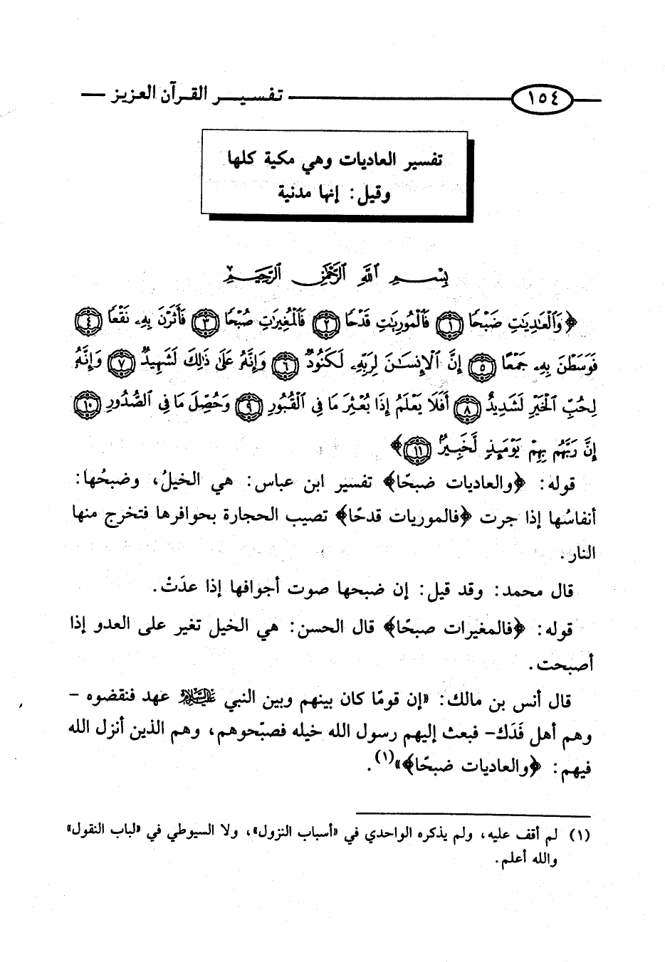 تَفْسِيرُ الْعَادِيَاتِ وَهِيَ مَكِّيَّةٌ كُلُّهَا وَقِيلَ: إِنَّهَا مَدَنِيَّةٌ