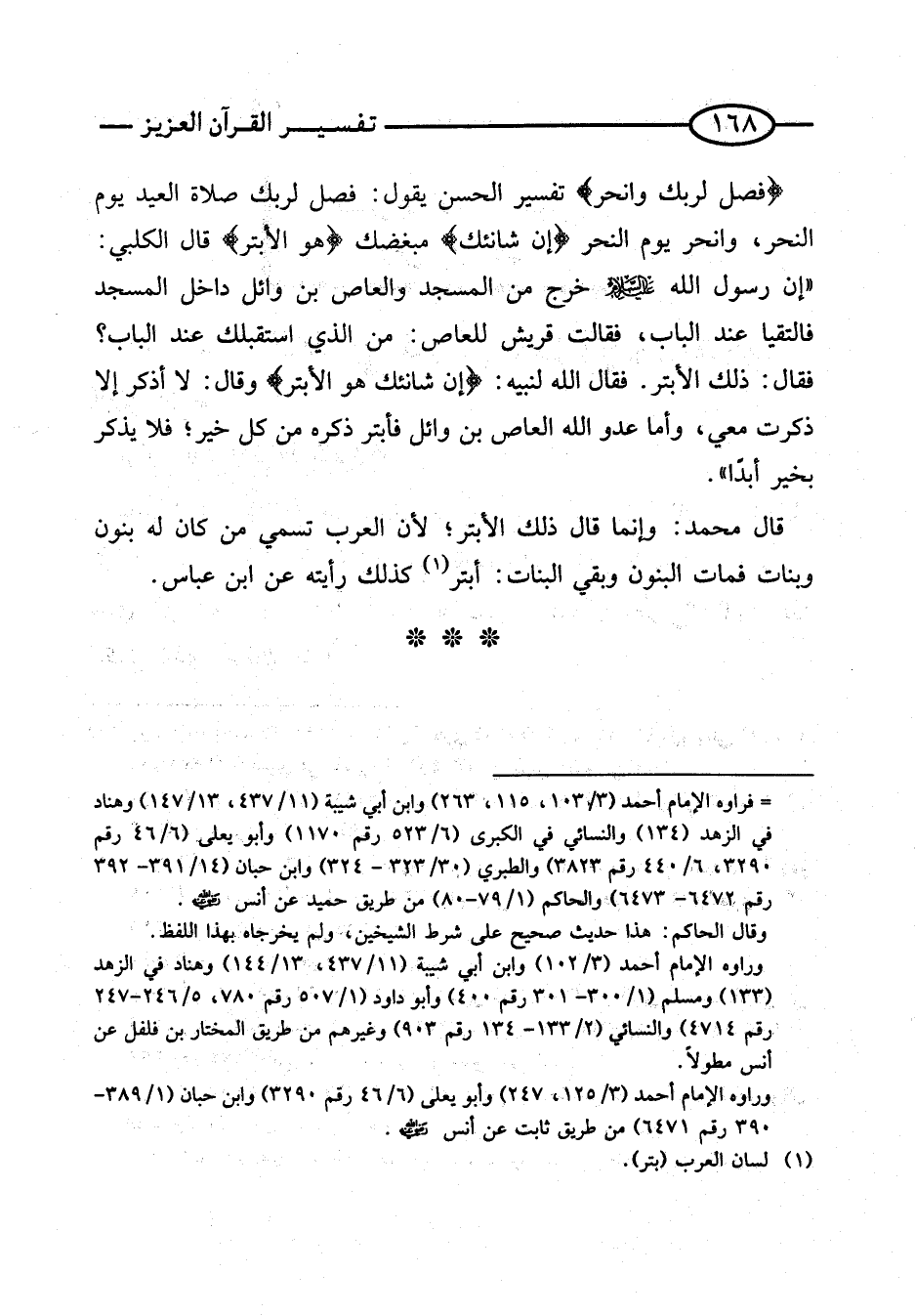 {فصل لِرَبِّك وانحر} تَفْسِيرُ الْحَسَنِ يَقُولُ: فَصَلِّ لِرَبِّكَ صَلاةَ الْعِيدِ يَوْمَ النَّحْرِ، وَانْحَرْ يَوْم النَّحْر {إِن شانئك} مبغضك {هُوَ الأبتر} قَالَ الْكَلْبِيُّ: " إِنَّ رَسُولَ اللَّهِ [صَلَّى اللَّهُ عَلَيْهِ وَسَّلَّمَ] خَرَجَ مِنَ الْمَسْجِدِ وَالْعَاصُ بْنُ وَائِلٍ دَاخِلٌ الْمَسْجِدِ فَالْتَقَيَا عِنْدَ الْبَابِ، فَقَالَتْ قُرَيْشٌ لِلْعَاصِ: مَنِ الَّذِي اسْتَقْبَلَكَ عِنْدَ الْبَابِ؟ فَقَالَ: ذَلِكَ الأبتر.