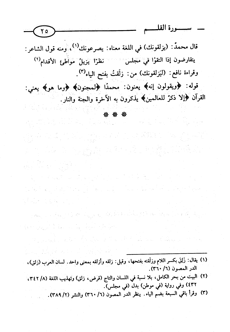 قَالَ محمدٌ: (يزلقونك) فِي اللُّغَةِ مَعْنَاهُ: يَصْرَعُونَكَ، وَمِنْهُ قَوْلُ الشَّاعِرِ: ... يَتَقَارَضُونَ إِذَا التقوْا فِي مَجْلِسٍ ... نَظَرًا يزيلُ مواطئَ الْأَقْدَامِ ... وَقِرَاءَةُ نَافِعٍ: (ليَزلقونك) مِنْ: زلَقتُ بِفَتْحِ الْيَاءِ.