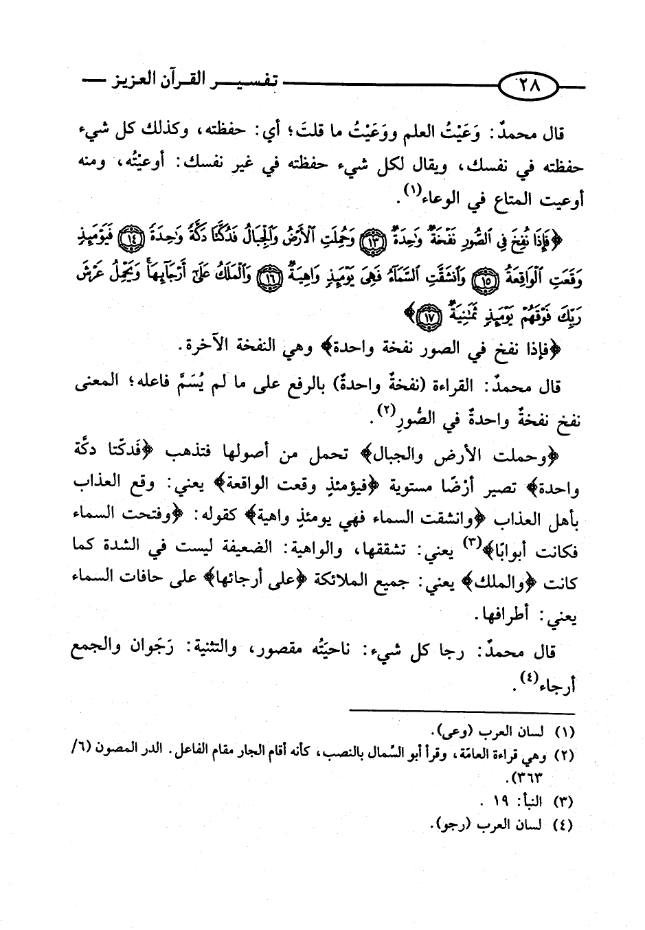 قَالَ محمدٌ: وَعَيْتُ الْعلم وووَعَيْتُ مَا قلتَ؛ أَيْ: حَفِظْتُهُ، وَكَذَلِكَ كُلَّ شَيْءٍ حَفِظْتُهُ فِي نَفْسِكَ، وَيُقَالُ لِكُلِّ شَيْءٍ حَفِظْتَهُ فِي غَيْرِ نَفْسِكَ: أوعيْته، وَمِنْهُ أوعيت الْمَتَاع فِي الْوِعَاء. تَفْسِير سُورَة الحاقة من آيَة (13 - 17)