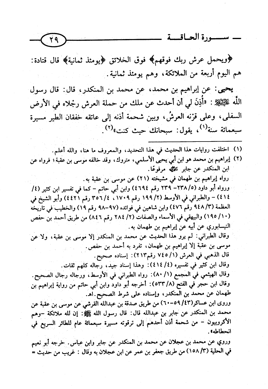 يَحْيَى: عَنْ إِبْرَاهِيمَ بْنِ مُحَمَّدٍ، عَنْ مُحَمَّدِ بْنِ الْمُنْكَدِرِ، قَالَ: قَالَ رَسُولُ اللَّهِ صَلَّى اللَّهُ عَلَيْهِ وَسلم: ((أُذِنَ لِي أَنْ أُحَدِّثَ عَنْ مَلَكٍ مِنْ حَمَلَةِ الْعَرْشِ رجْلاه فِي الْأَرْضِ السُّفْلَى، وَعَلَى قرْنه العرشُ، وَبَيْنَ شَحْمَةِ أُذُنِهِ إِلَى عَاتِقه خفقان الطير مسيرَة سَبْعمِائة سَنَةٍ، يَقُولُ: سُبْحَانَكَ حَيْثُ كُنْتَ)).