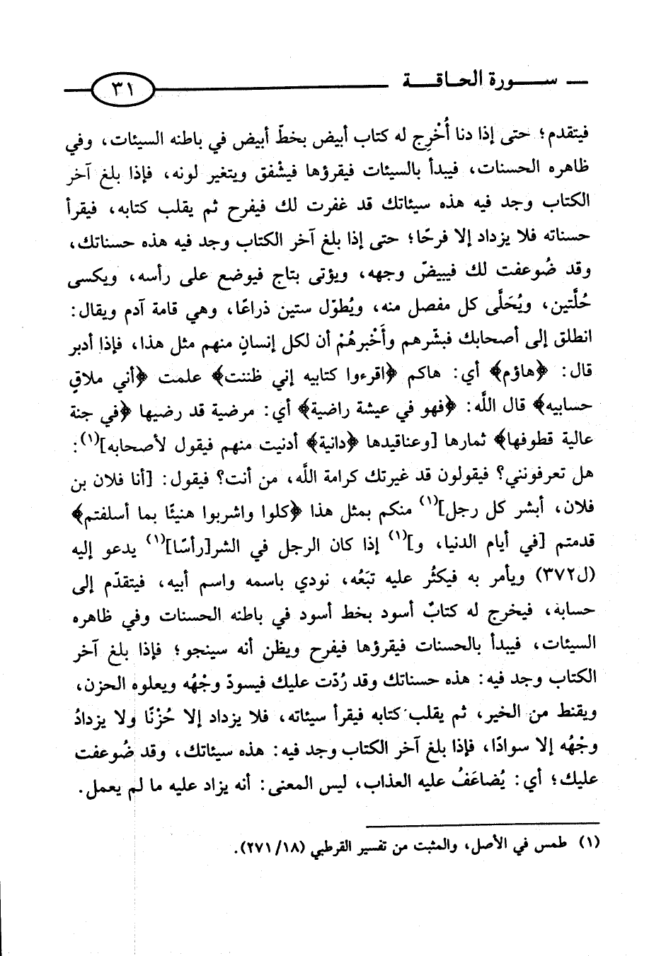 و] إِذا كَانَ الرَّجُلُ فِي الشَّرِّ] رَأْسًا [يَدْعُو إِلَيْهِ (ل 372) وَيَأْمُرُ بِهِ فيكثُر عَلَيْهِ تبَعُه، نُودِيَ بِاسْمِهِ وَاسْمِ أَبِيهِ، فَيَتَقَدَّمُ إِلَى حِسَابِهِ، فَيَخْرُجُ لَهُ كتابٌ أَسْوَدٌ بِخَطٍّ أَسْوَدٍ فِي بَاطِنِهِ الْحَسَنَاتُ وَفِي ظَاهِرِهِ السَّيِّئَاتُ، فَيَبْدَأُ بِالْحَسَنَاتِ فَيَقْرَؤُهَا فَيَفْرَحُ وَيَظُنُّ أَنَّهُ سَيَنْجُو؛ فَإِذَا بَلَغَ آخِرَ الْكِتَابِ وَجَدَ فِيهِ: هَذِهِ حَسَنَاتُكَ وَقَدْ رُدت عَلَيْكَ فَيَسْوَدُّ وجهُه وَيَعْلُوهُ الْحُزْنُ، وَيَقْنَطُ مِنَ الْخَيْرِ، ثُمَّ يَقْلِبُ كِتَابَهُ فَيَقْرَأُ سَيِّئَاتَهُ، فَلا يَزْدَادُ إِلَّا حُزْنًا وَلا يزدادُ وجْهُه إِلَّا سَوَادًا، فَإِذَا بَلَغَ آخِرَ الْكِتَابِ وَجَدَ فِيهِ: هَذِهِ سَيِّئَاتُكَ، وَقَدْ ضُوعفت عَلَيْكَ؛ أَيْ: يُضاعَفُ عَلَيْهِ الْعَذَابُ، لَيْسَ الْمَعْنَى: أَنَّهُ يُزَادُ عَلَيْهِ مَا لَمْ يَعْمَلْ.