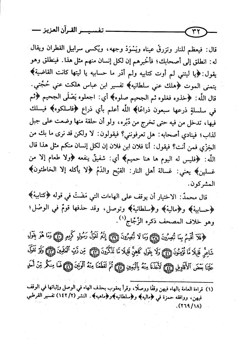 قَالَ محمدٌ: الِاخْتِيَارُ أَنْ يُوقَفَ عَلَى الْهَاءَاتِ الَّتِي مَضَتْ فِي قَوْله {كِتَابيه} {حسابيه} و {ماليه} و {سلطانيه} وَتُوصَلُ، وَقَدْ حَذَفَهَا قومٌ فِي الوصْل؛ وَهُوَ خِلافُ الْمُصْحَفِ ذَكَرَهُ الزَّجَّاج. تَفْسِير سُورَة الحاقة من آيه (38 - 46)