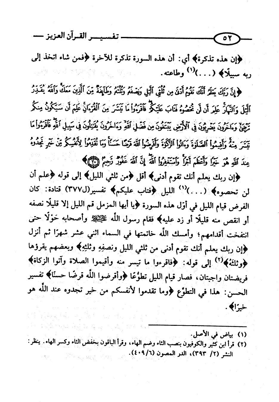 {إِنَّ رَبَّكَ يَعْلَمُ أَنَّكَ تَقُومُ أدنى} أَقَلَّ {مِنْ ثُلُثَيِ اللَّيْلِ} إِلَى قَوْلِهِ {عَلِمَ أَنْ لَنْ تُحْصُوهُ} اللَّيْل {فَتَابَ عَلَيْكُم} تَفْسِير (ل 377) قَتَادَةَ: كَانَ الْفَرْضُ قِيَامَ اللَّيْلِ فِي أوّل هَذِه السُّورَة {يَا أَيهَا الْمُزَّمِّلُ قُمِ اللَّيْلَ إِلا قَلِيلا نِصْفَهُ أَوِ انْقُصْ مِنْهُ قَلِيلا أَو زد عَلَيْهِ} فَقَامَ رَسُولَ اللَّهِ صَلَّى اللَّهُ عَلَيْهِ وَسلم وَأَصْحَابُهُ حَوْلاً حَتَّى انْتَفَخَتْ أَقْدَامُهُمْ؛ وَأَمْسَكَ اللَّهُ خَاتِمَتَهَا فِي السَّمَاءِ اثْنَي عَشَرَ شَهْرًا ثُمَّ أَنْزَلَ {إِنَّ رَبَّكَ يَعْلَمُ أَنَّكَ تَقُومُ أَدْنَى مِنْ ثُلُثَيِ اللَّيْلِ وَنِصْفَهُ وَثلثه} وبعضعم يقْرؤهَا {وَثلثه} إِلَى قَوْلِهِ: {فَاقْرَءُوا مَا تَيَسَّرَ مِنْهُ وَأَقِيمُوا الصَّلاةَ وَآتُوا الزَّكَاةَ} فَرِيضَتَانِ وَاجِبَتَانِ، فَصَارَ قِيَامُ اللَّيْلِ تطوُّعًا {وَأَقْرِضُوا اللَّهَ قَرْضًا حَسَنًا} تَفْسِيرُ الْحَسَنِ: هَذَا فِي التطوَّع {وَمَا تُقَدِّمُوا لأَنْفُسِكُمْ مِنْ خَيْرٍ تَجِدُوهُ عِنْدَ اللَّهِ هُوَ خَيْرًا}.