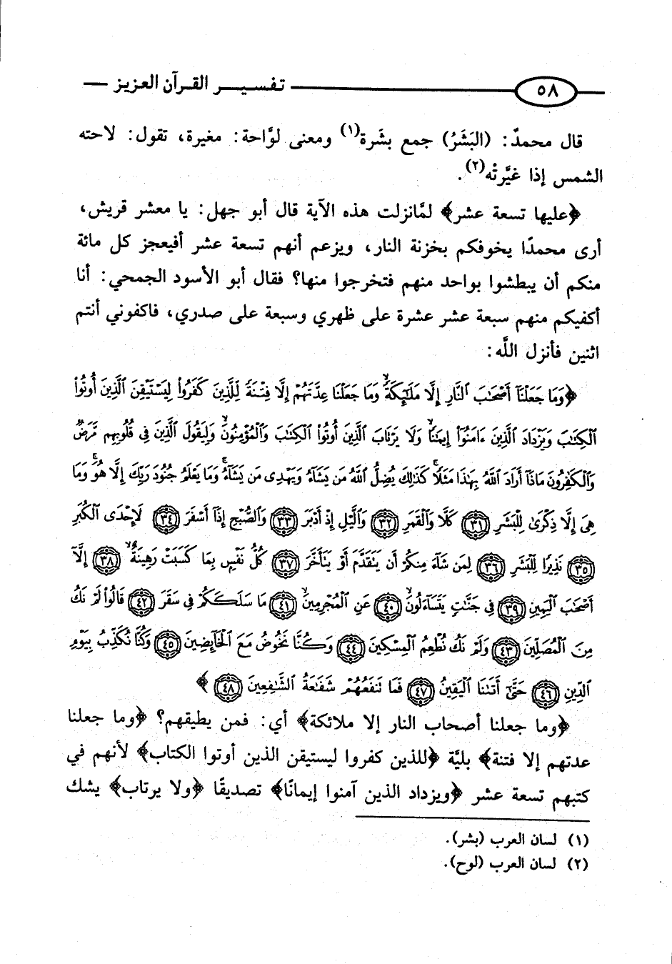 {عَلَيْهَا تِسْعَة عشر} لمَّا نَزَلَتْ هَذِهِ الْآيَةُ قَالَ أَبُو جَهْلٍ: يَا مَعْشَرَ قُرَيْشٍ، أَرَى مُحَمَّدًا يُخَوِّفُكُمْ بِخَزَنَةِ النَّارِ، وَيَزْعُمْ أَنَّهُمْ تِسْعَةَ عَشَرَ أَفَيَعْجَزُ كُلُّ مِائَةٍ مِنْكُمْ أَنْ يَبْطِشُوا بِوَاحِدٍ مِنْهُمْ فَتَخْرُجُوا مِنْهَا؟ فَقَالَ أَبُو الْأَسْوَدِ الْجُمَحِيُّ: أَنَا أَكْفِيكُمْ مِنْهُمْ سَبْعَةَ عَشَرَ عَشْرَةٌ عَلَى ظَهْرِي وَسَبْعَةٌ عَلَى صَدْرِي، فَاكْفُونِي أَنْتُم اثْنَيْنِ فَأنْزل الله: تَفْسِير سُورَة المدثر من آيَة (31 - 48)