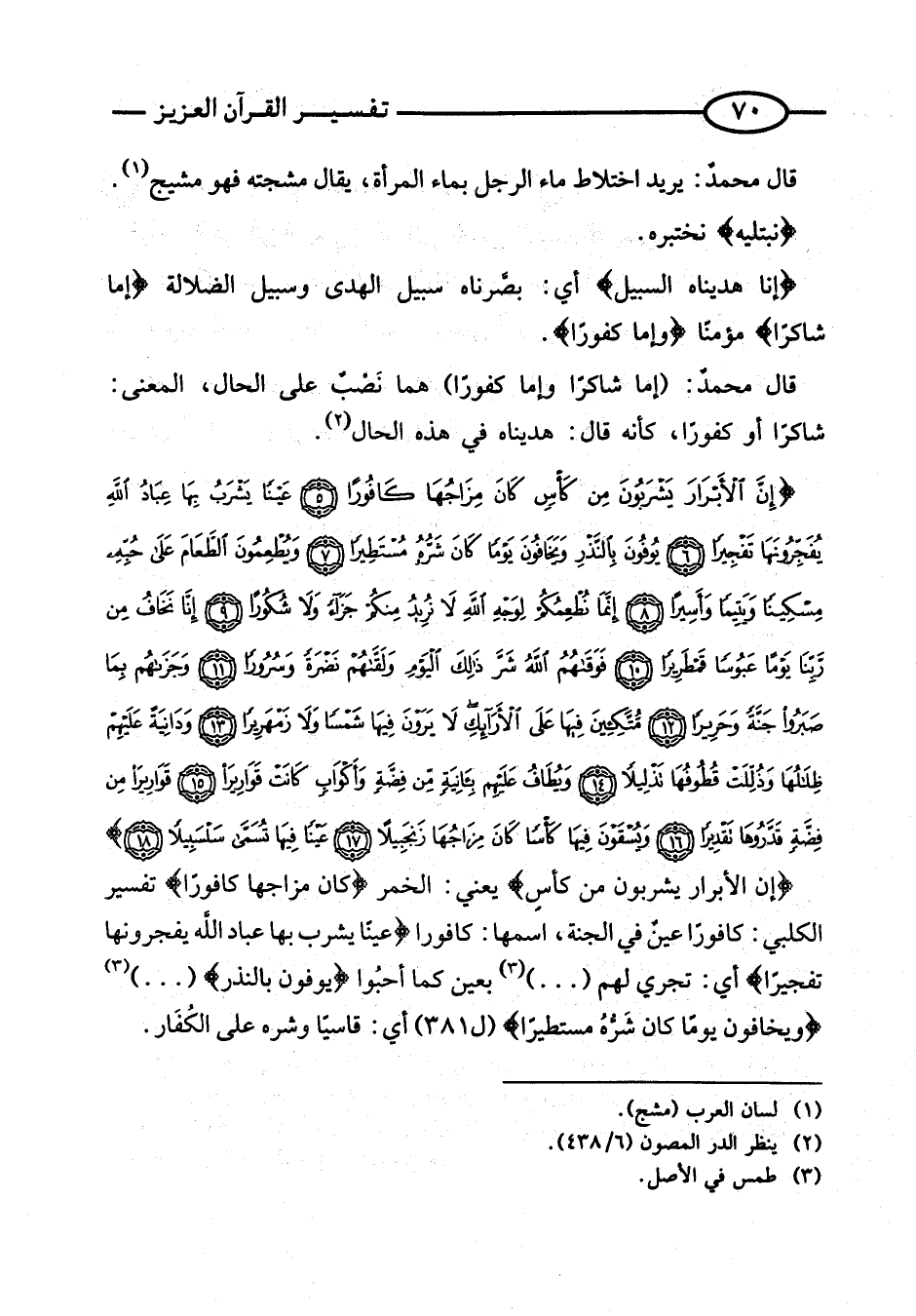{إِنَّ الأَبْرَارَ يَشْرَبُونَ مِنْ كَأْسٍ} يَعْنِي: الْخَمْرَ {كَانَ مِزَاجُهَا كَافُورًا} تَفْسِيرُ الْكَلْبِيِّ: كَافُورًا عينٌ فِي الْجنَّة، اسْمهَا: كافورا
