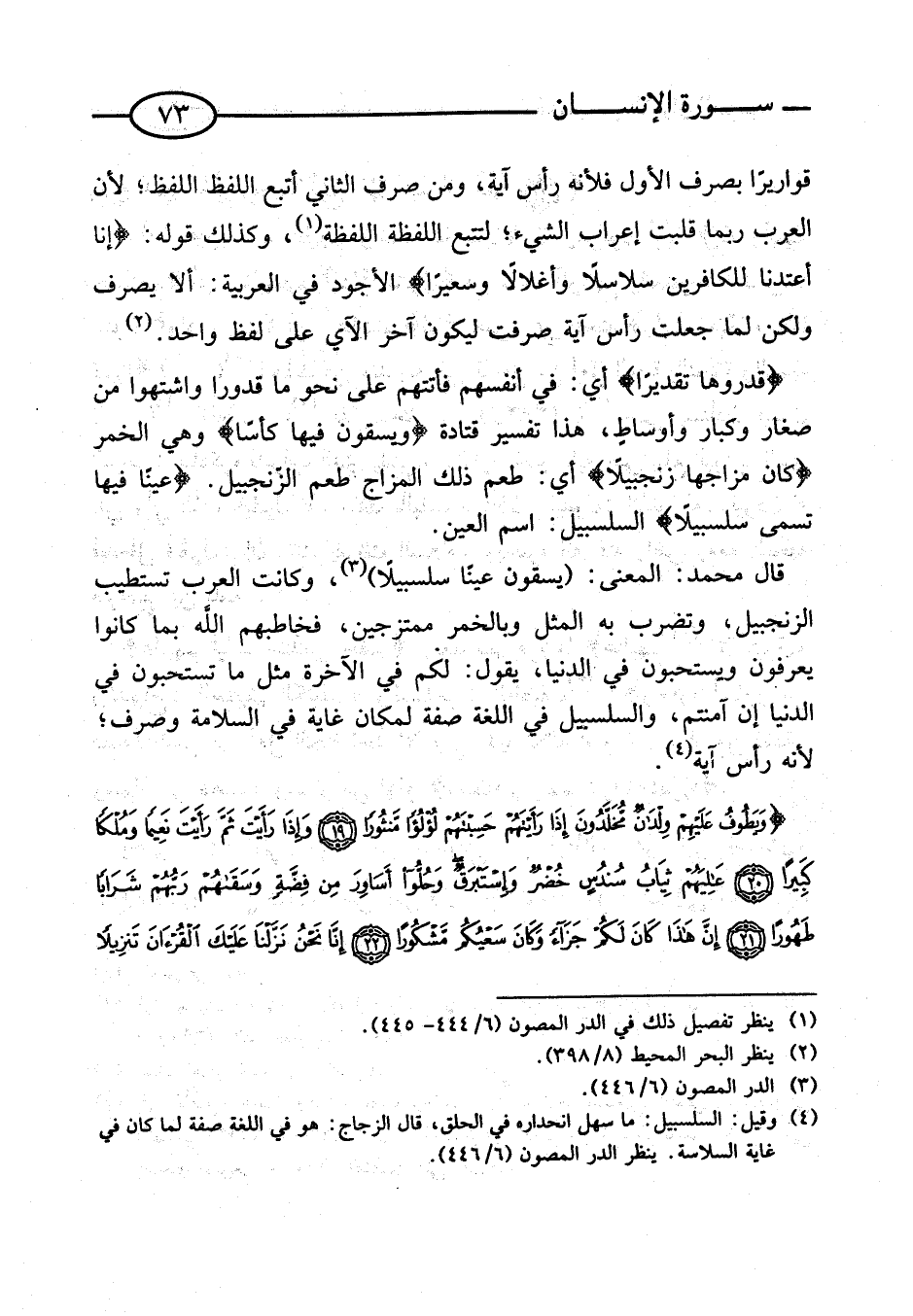 قَالَ مُحَمَّدٌ: الْمَعْنَى: (يُسْقَوْنَ عَيْنًا سَلْسَبِيلًا)، وَكَانَتِ الْعَرَب تستطيب الزنجيل، وَتَضْرِبُ بِهِ الْمَثَلُ وَبِالْخَمْرِ مُمْتَزِجِينَ، فَخَاطَبَهُمُ اللَّهُ بِمَا كَانُوا يَعْرِفُونَ وَيَسْتَحِبُّونَ فِي الدُّنْيَا، يَقُولُ: لَكُمْ فِي الْآخِرَةِ مِثْلُ مَا تَسْتَحِبُّونَ فِي الدُّنْيَا إِنْ آمَنْتُمْ، وَالسَّلْسَبِيلُ فِي اللُّغَةِ صِفَةٌ لِمَكَانٍ غَايَةٍ فِي السَّلامَةِ وَصُرِفَ؛ لِأَنَّهُ رَأْسُ آيَة. تَفْسِير سُورَة الْإِنْسَان من آيَة (19 - 22)