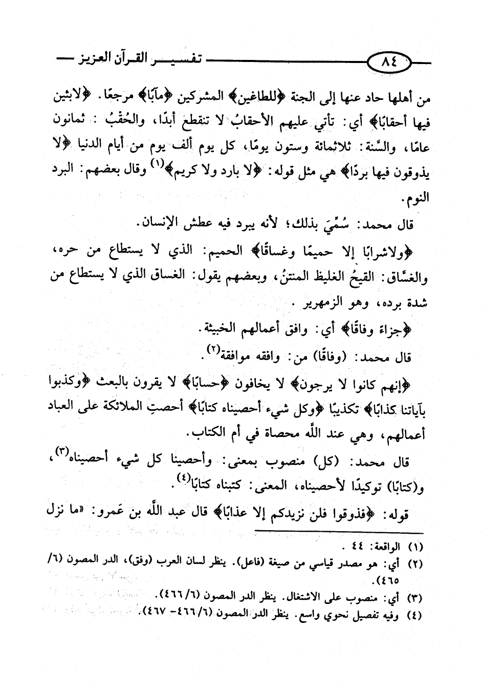 {إِلَّا حميما وغساقا} الْحَمِيمُ: الَّذِي لَا يُسْتَطَاعُ مِنْ حَرِّهِ، والغسَّاق: القيحُ الْغَلِيظُ المنتنُ، وَبَعْضُهُمْ يَقُولُ: الْغَسَّاقُ الَّذِي لَا يُسْتَطَاعُ مِنْ شِدَّةِ بَرْدِهِ، وَهُو الزَّمْهَرِير.