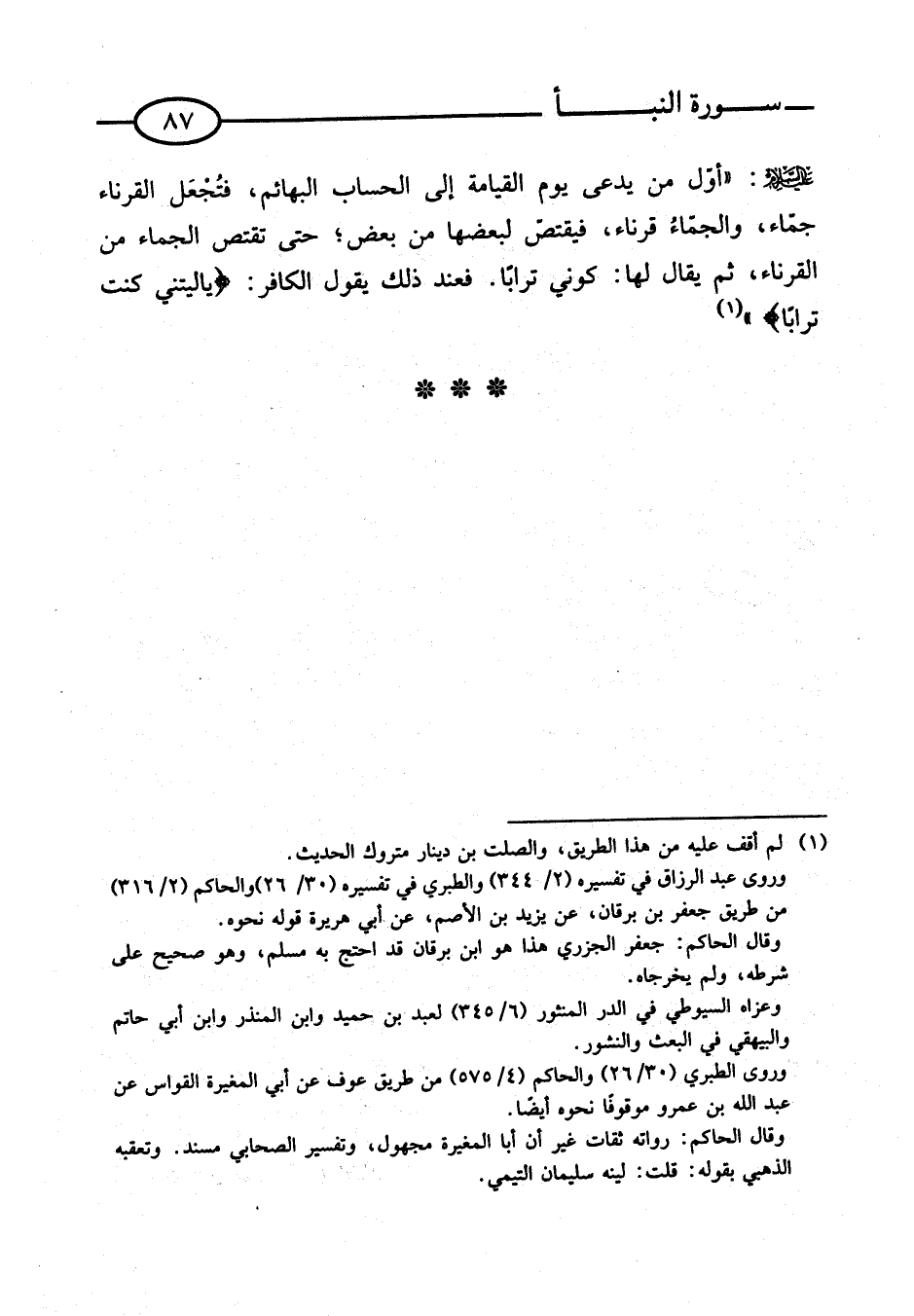 صَلَّى اللَّهُ عَلَيْهِ وَسَلَّمَ ((أول مَنْ يُدْعَى يَوْمَ الْقِيَامَةِ إِلَى الْحِسَابِ الْبَهَائِمُ، فتُجْعَل الْقَرْنَاءُ جَمَّاءَ، وَالْجَمَّاءُ قَرْنَاءَ، فَيَقْتَصُّ لِبَعْضِهَا مِنْ بَعْضٍ؛ حَتَّى تَقْتَصَّ الْجَمَّاءُ مِنَ الْقَرْنَاءِ، ثُمَّ يُقَالُ لَهَا: كُونِي تُرَابًا. فَعِنْدَ ذَلِكَ يَقُولُ الْكَافِرُ: {يَا لَيْتَني كنت تُرَابا}))