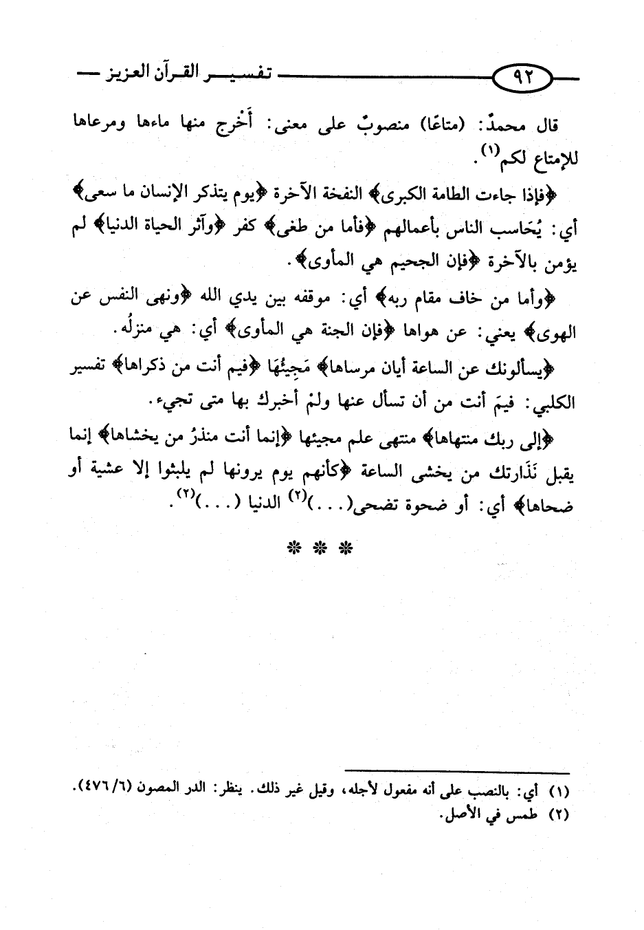 {فيمَ أَنْت من ذكرَاهَا} تَفْسِيرُ الْكَلْبِيِّ: فِيمَ أَنْتَ مِنْ أَنْ تَسْأَلَ عَنْهَا وَلَمْ أُخْبِرْكَ بهَا مَتى تَجِيء.