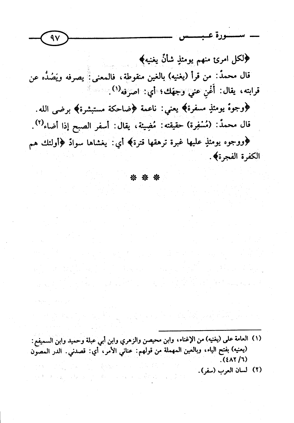 قَالَ محمدٌ: مَنْ قَرَأَ (يُغْنِيهِ) بِالْغَيْنِ مَنْقُوطَةٌ، فَالْمَعْنَى: يَصْرِفُهُ ويَصُدُّه عَنْ قَرَابَتِهِ، يُقَالُ: أَغْنِ عَنِّي وجهَك؛ أَي اصرفه.