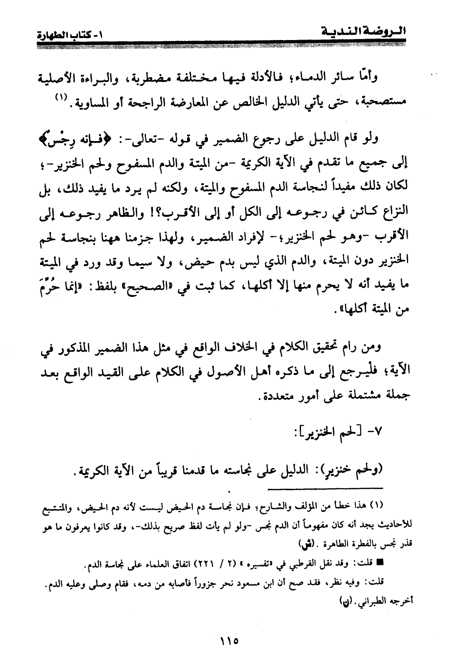 ولو قام الدليل على رجوع الضمير في قوله - تعالى -: {فإنه رجس} إلى جميع ما تقدم في الآية الكريمة - من الميتة والدم المسفوح ولحم الخنزير -؛ لكان ذلك مفيداً لنجاسة الدم المسفوح والميتة، ولكنه لم يرد ما يفيد ذلك، بل النزاع كائن في رجوعه إلى الكل أو إلى الأقرب؟ ! والظاهر رجوعه إلى الأقرب - وهو لحم الخنزير؛ - لإفراد الضمير، ولهذا جزمنا ههنا بنجاسة لحم الخنزير دون الميتة، والدم الذي ليس بدم حيض، ولا سيما وقد ورد في الميتة ما يفيد أنه لا يحرم منها إلا أكلها، كما ثبت في " الصحيح " بلفظ: " إنما حُرِّم من الميتة أكلها ".