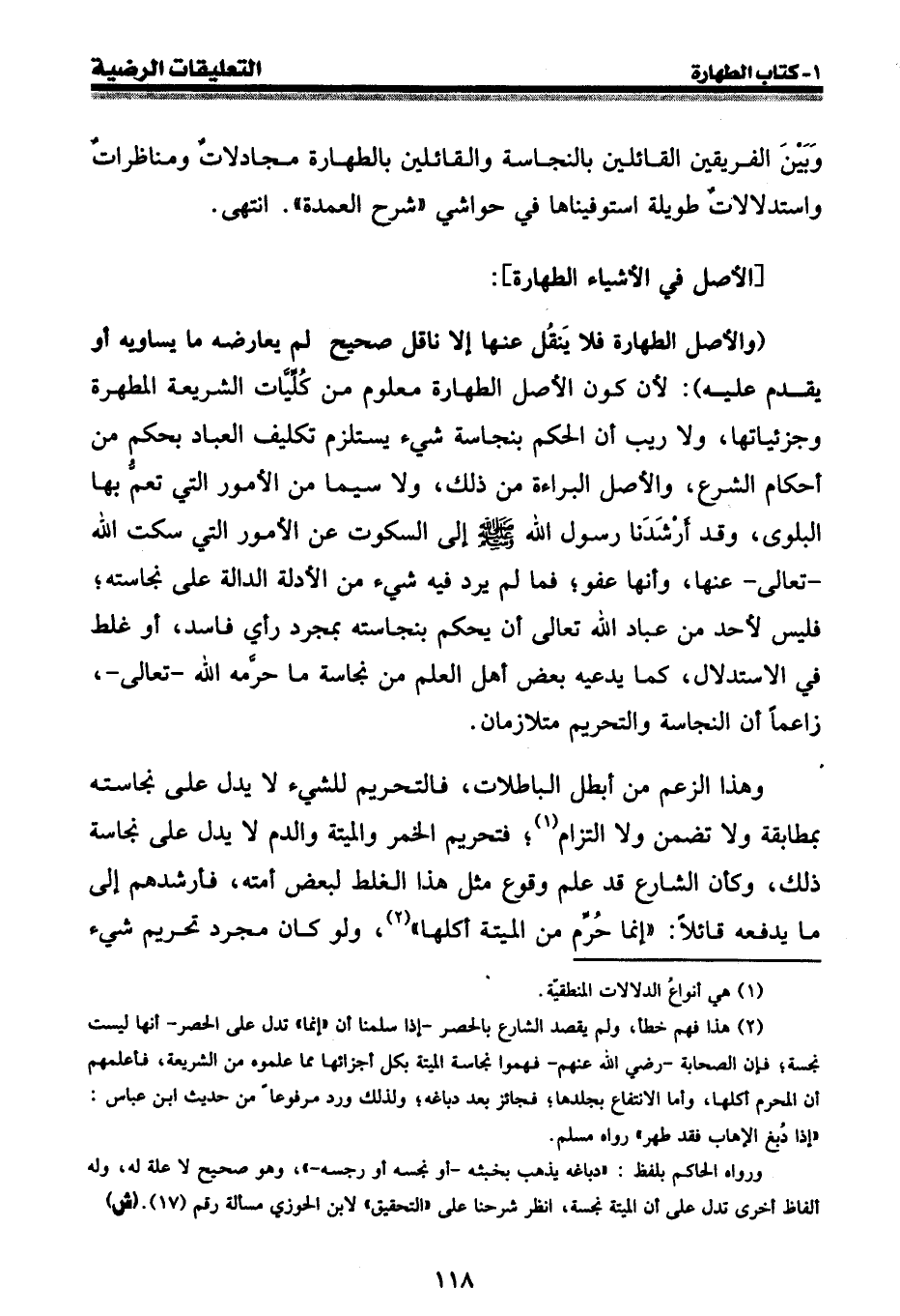 (والأصل الطهارة فلا ينقل عنها إلا ناقل صحيح لم يعارضه ما يساويه أو يقدم عليه) : لأن كون الأصل الطهارة معلوم من كليات الشريعة المطهرة وجزئياتها، ولا ريب أن الحكم بنجاسة شيء يستلزم تكليف العباد بحكم من أحكام الشرع، والأصل البراءة من ذلك، ولا سيما من الأمور التي تعم بها البلوى، وقد أرشدنا رسول الله [صلى الله عليه وسلم] إلى السكوت عن الأمور التي سكت الله - تعالى - عنها، وأنها عفو؛ فما لم يرد فيه شيء من الأدلة الدالة على نجاسته؛ فليس لأحد من عباد الله تعالى أن يحكم بنجاسته بمجرد رأي فاسد، أو غلط في الاستدلال، كما يدعيه بعض أهل العلم من نجاسة ما حرّمه الله - تعالى -، زاعماً أن النجاسة والتحريم متلازمان.