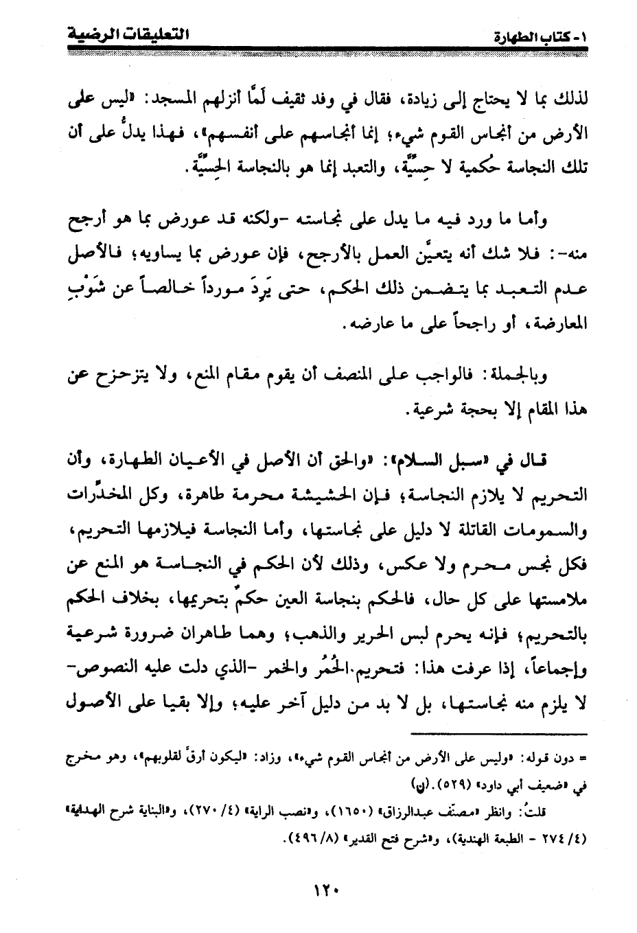 قال في " سبل السلام ": " والحق أن الأصل في الأعيان الطهارة، وأن التحريم لا يلازم النجاسة؛ فإن الحشيشة محرمة طاهرة، وكل المخدرات والسمومات القاتلة لا دليل على نجاستها، وأما النجاسة فيلازمها التحريم فكل نجس محرم ولا عكس، وذلك لأن الحكم في النجاسة هو المنع عن ملامستها على كل حال، فالحكم بنجاسة العين حكم بتحريمها، بخلاف الحكم بالتحريم؛ فإنه يحرم لبس الحرير والذهب؛ وهما طاهران ضرورة شرعية وإجماعاً، إذا عرفت هذا: فتحريم الحُمُر والخمر - الذي دلت عليه النصوص - لا يلزم منه نجاستها، بل لا بد من دليل آخر عليه؛ وإلا بقيا على الأصول