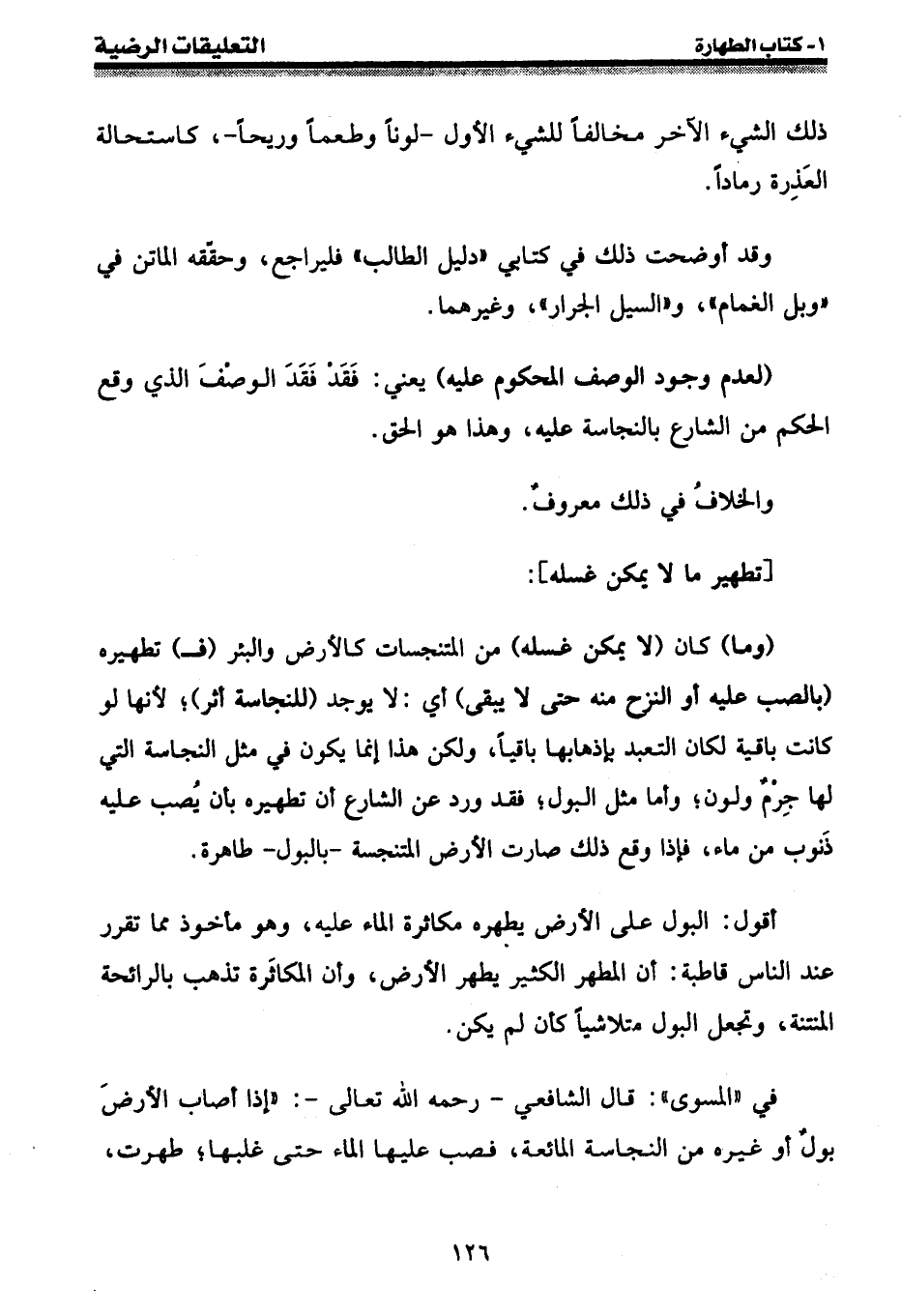 في " المسوى ": قال الشافعي - رحمه الله تعالى -: " إذا أصاب الأرض بول أو غيره من النجاسة المائعة، فصب عليها الماء حتى غلبها؛ طهرت،