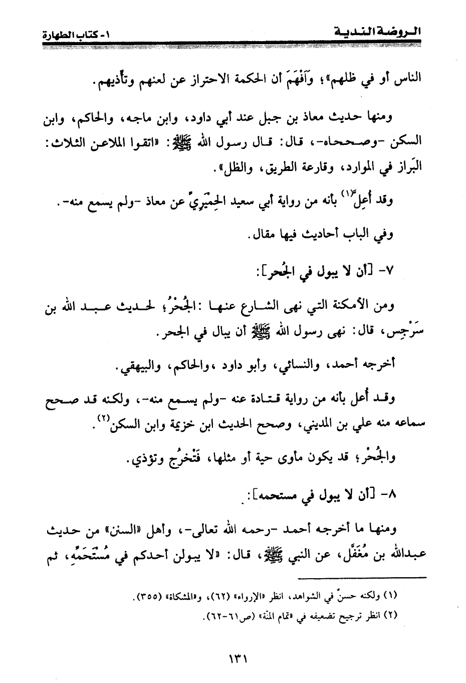 ومن الأمكنة التي نهى الشارع عنها: الجحر؛ لحديث عبد الله بن سرجس، قال: نهى رسول الله [صلى الله عليه وسلم] أن يبال في الجحر.