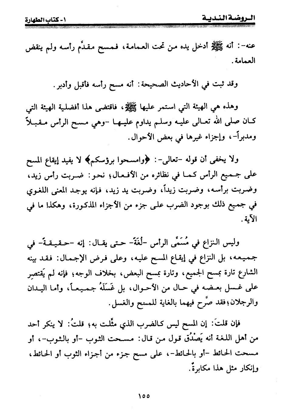 ولا يخفى أن قوله - تعالى -: {وامسحوا برؤسكم} لا يفيد إيقاع المسح على جميع الرأس كما في نظائره من الأفعال؛ نحو: ضربت رأس زيد، وضربت برأسه، وضربت زيداً، وضربت يد زيد، فإنه يوجد المعنى اللغوي في جميع ذلك بوجود الضرب على جزء من الأجزاء المذكورة، وهكذا ما في الآية.