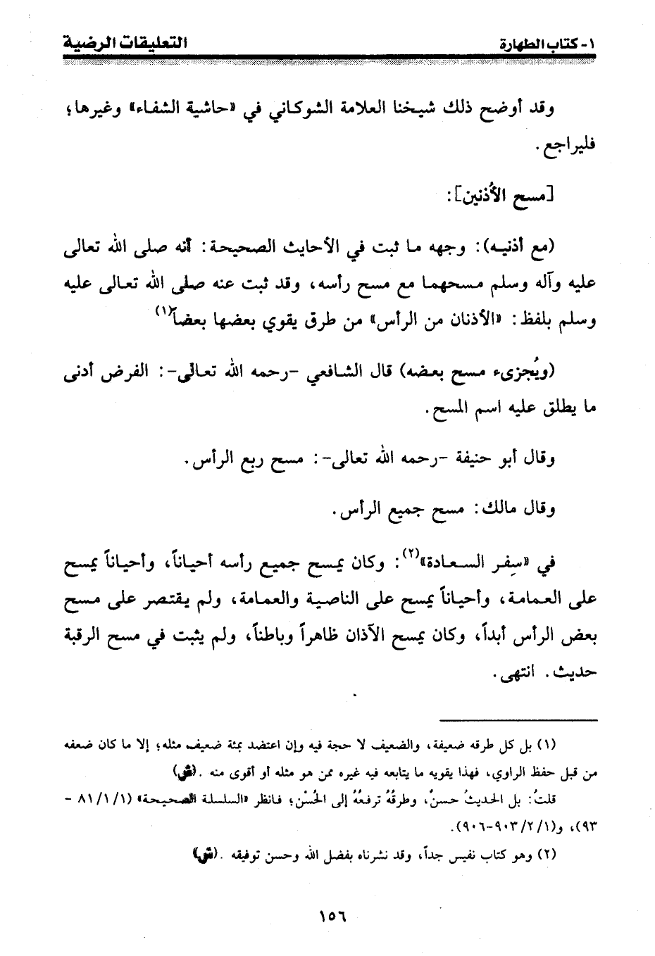 في " سفر السعادة " (¬2) : وكان يمسح جميع رأسه أحيانا، وأحيانا يمسح على العمامة، وأحيانا يمسح على الناصية والعمامة، ولم يقتصر على مسح بعض الرأس أبدا، وكان يمسح الآذان ظاهرا وباطنا، ولم يثبت في مسح الرقبة حديث. انتهى.