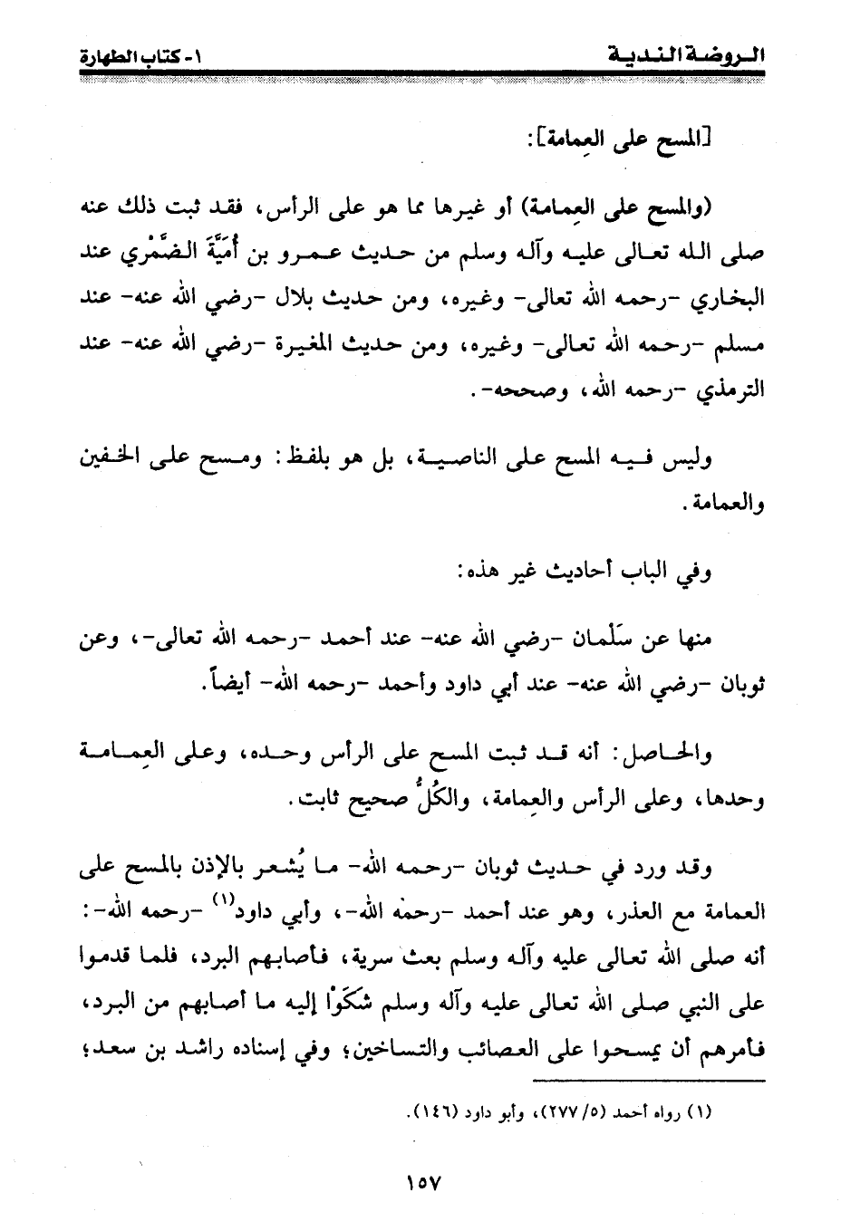 (والمسح على العمامة) أو غيرها مما هو على الرأس، فقد ثبت ذلك عنه [صلى الله عليه وسلم] من حديث عمرو بن أمية الضمري عند البخاري - رحمه الله تعالى - وغيره، ومن حديث بلال - رضي الله عنه - عند مسلم - رحمه الله تعالى - وغيره، ومن حديث المغيرة - رضي الله عنه - عند الترمذي - رحمه الله، وصححه -.