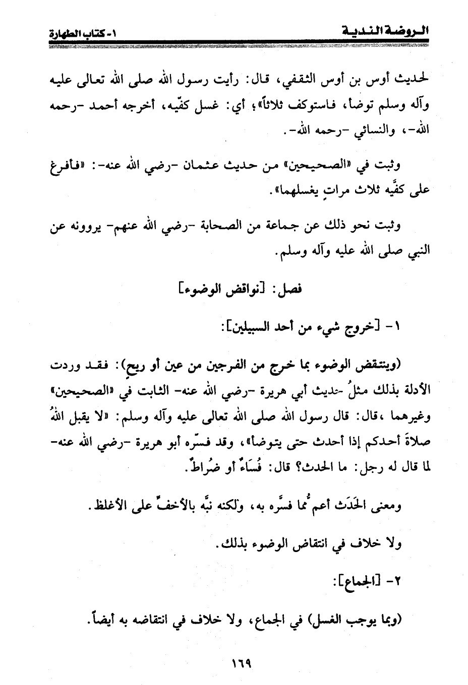 (وينتقض الوضوء بما خرج من الفرجين من عين أو ريح) : فقد وردت الأدلة بذلك مثل حديث أبي هريرة - رضي الله عنه - الثابت في " الصحيحين " وغيرهما، قال: قال رسول الله [صلى الله عليه وسلم] : " لا يقبل الله صلاة أحدكم إذا أحدث حتى يتوضأ "، وقد فسره أبو هريرة - رضي الله عنه - لما قال له رجل: ما الحدث؟ قال: فساء أو ضراط.