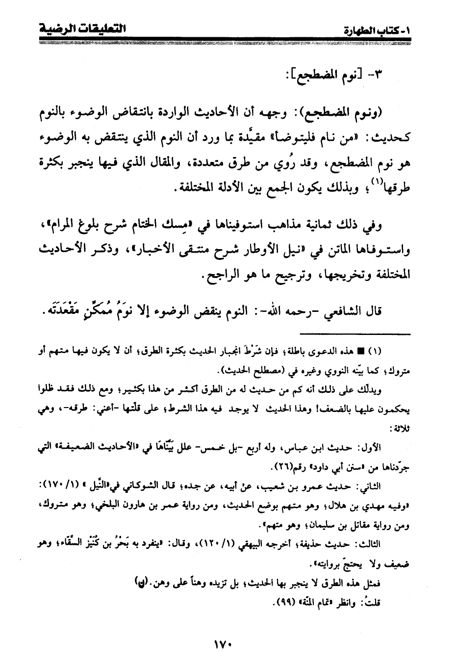 (ونوم المضطجع) : وجهه أن الأحاديث الواردة بانتقاض الوضوء بالنوم كحديث: " من نام فليتوضأ " مقيدة بما ورد أن النوم الذي ينتقض به الوضوء هو نوم المضطجع، وقد روي من طرق متعددة، والمقال الذي فيها ينجبر بكثرة طرقها (¬1) ؛ وبذلك يكون الجمع بين الأدلة المختلفة.