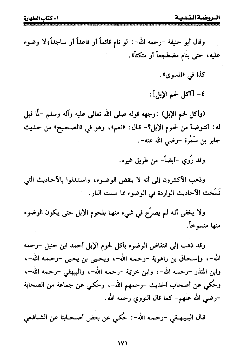 (وأكل لحم الإبل) : وجهه قوله [صلى الله عليه وسلم]- لما قيل له: أنتوضأ من لحوم الإبل؟ - قال: " نعم "، وهو في " الصحيح " من حديث جابر بن سمرة - رضي الله عنه -.