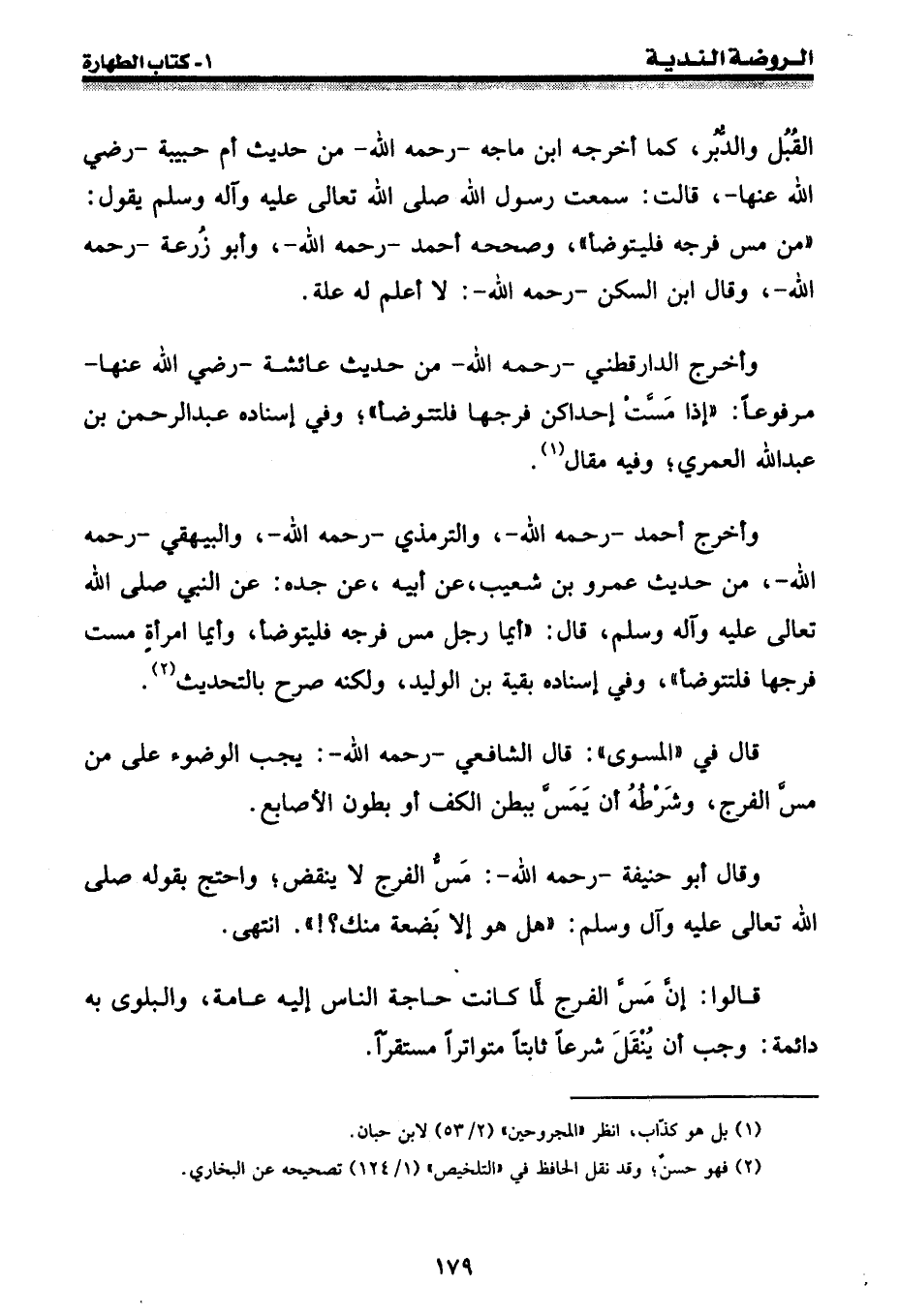 وأخرج أحمد - رحمه الله -، والترمذي - رحمه الله -، والبيهقي - رحمه الله -، من حديث عمرو بن شعيب، عن أبيه، عن جده: عن النبي [صلى الله عليه وسلم] قال: " أيما رجل مس فرجه فليتوضأ، وأيما امرأة مست فرجها فلتتوضأ "، وفي إسناده بقية بن الوليد، ولكنه صرح بالتحديث (¬2) .