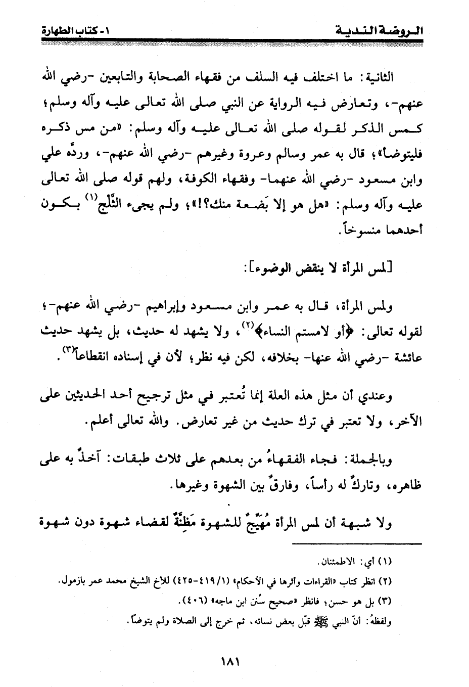 الثانية: ما اختلف فيه السلف من فقهاء الصحابة والتابعين - رضي الله عنهم -، وتعارض فيه الرواية عن النبي [صلى الله عليه وسلم] ؛ كمس الذكر لقوله [صلى الله عليه وسلم] : " من مس ذكره فليتوضأ "؛ قال به عمر وسالم وعروة وغيرهم - رضي الله عنهم -، ورده علي وابن مسعود - رضي الله عنهما - وفقهاء الكوفة، ولهم قوله [صلى الله عليه وسلم] : " هل هو إلا بضعة منك؟ ! "؛ ولم يجيء الثلج (¬1) بكون أحدهما منسوخاً.