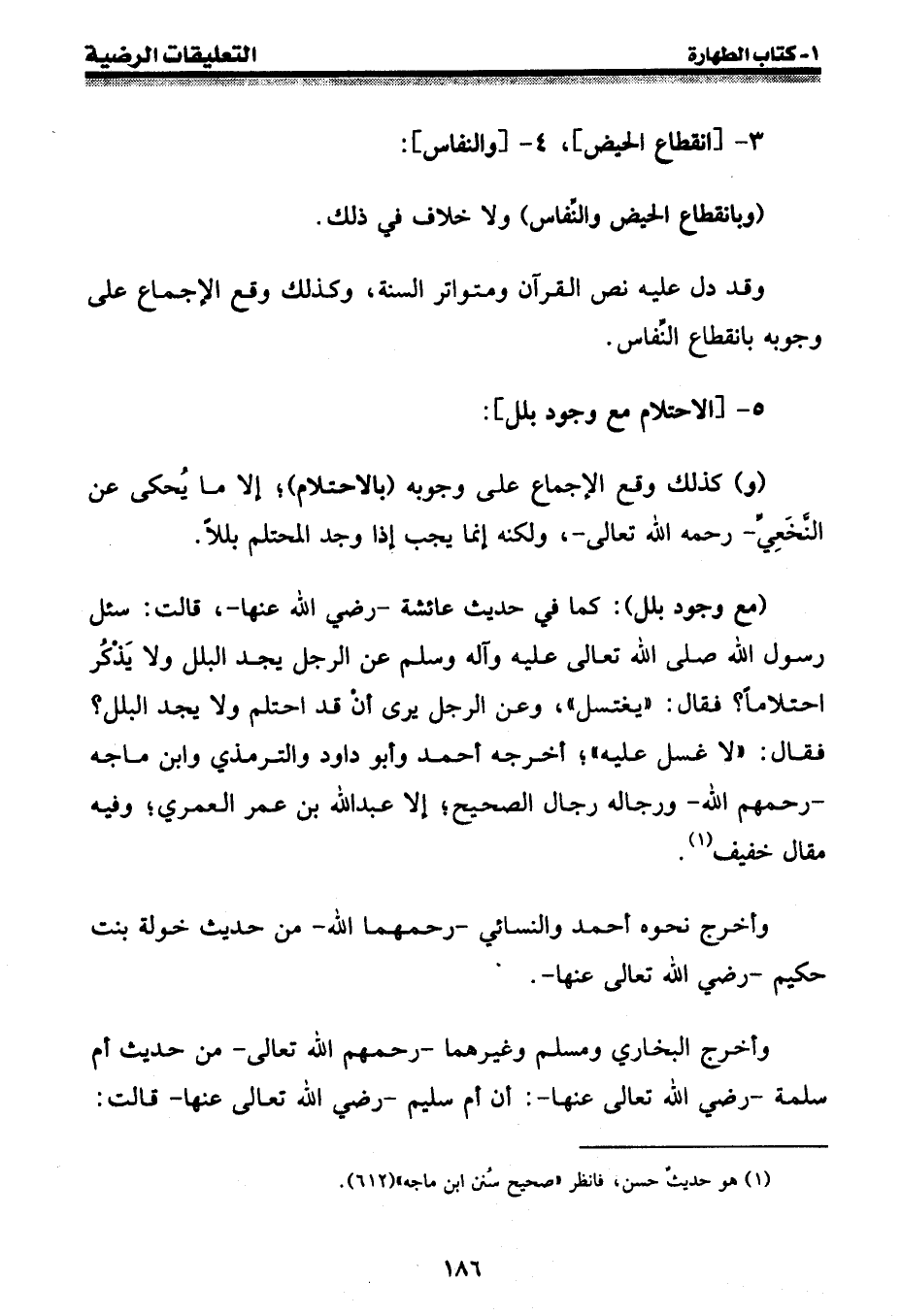 (مع وجود بلل) : كما في حديث عائشة - رضي الله عنها -، قالت: سئل رسول الله [صلى الله عليه وسلم] عن الرجل يجد البلل ولا يذكر احتلاماً؟ فقال: " يغتسل "، وعن الرجل يرى أن قد احتلم ولا يجد البلل؟ فقال: " لا غسل عليه "؛ أخرجه أحمد وأبو داود والترمذي وابن ماجه - رحمهم الله - ورجاله رجال الصحيح؛ إلا عبد الله بن عمر العمري؛ وفيه مقال خفيف (¬1) .