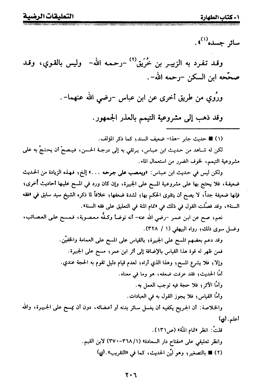 ولكن ليس في حديث ابن عباس: " ويعصب على جرحه ... " الخ؛ فهذه الزيادة من الحديث ضعيفة، فلا يحتج بها على مشروعية المسح على الجبيرة، وإن كان ورد في المسح عليها أحاديث أخرى؛ فإنها ضعيفة جداً، لا يصح أن يتقوى الحكم بها؛ لشدة ضعفها: خلافاً لما ذكره الشيخ سيد سابق في " فقه السنة "، وقد فصلت القول في ذلك في " تمام المنة في التعليق على فقه السنة ".