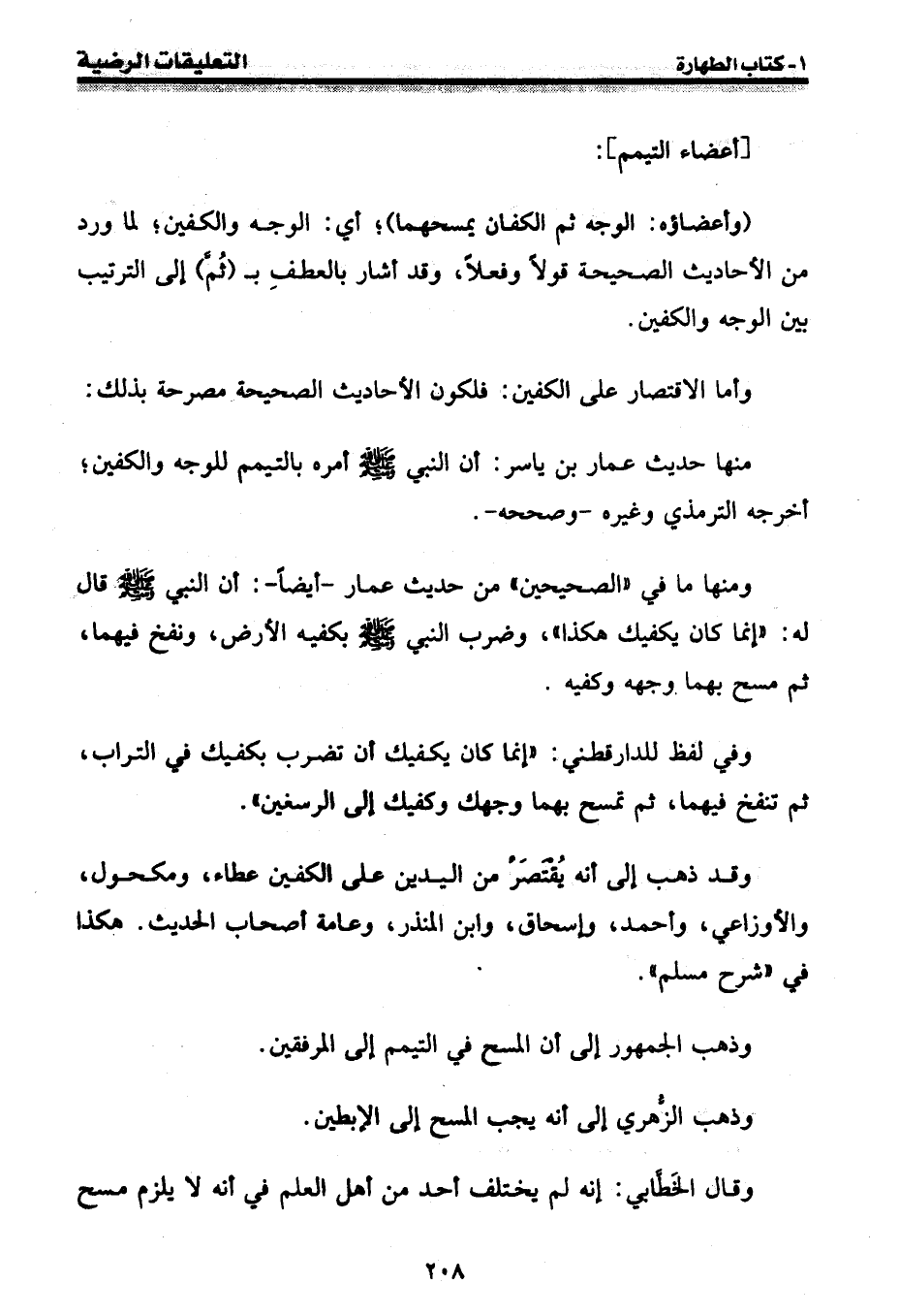 منها حديث عمار بن ياسر: أن النبي [صلى الله عليه وسلم] أمره بالتيمم للوجه والكفين؛ أخرجه الترمذي وغيره - وصححه -.