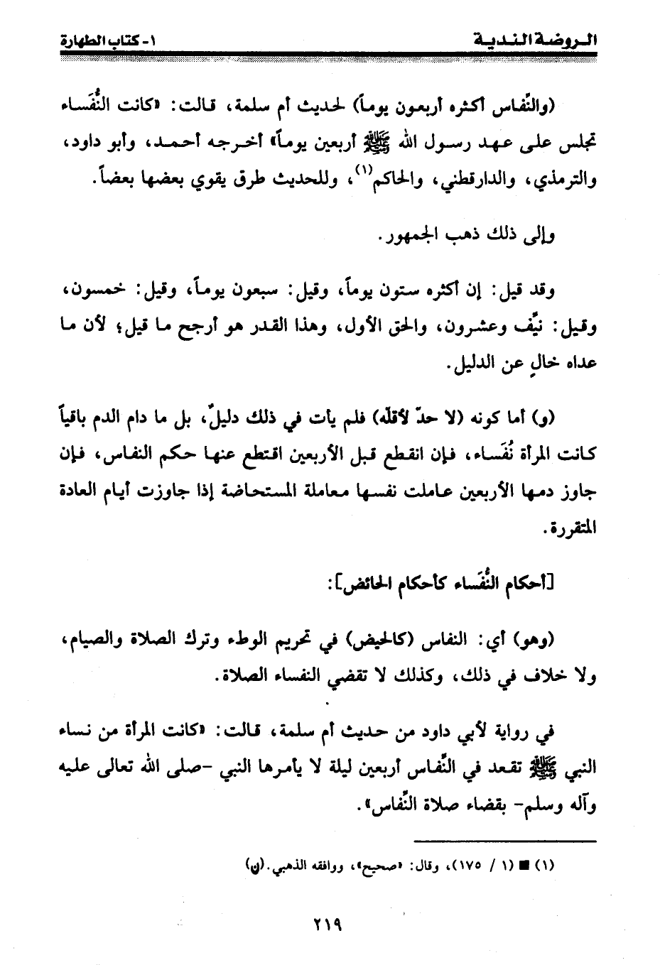 (والنفاس أكثره أربعون يوماً) لحديث أم سلمة، قالت: " كانت النفساء تجلس على عهد رسول الله [صلى الله عليه وسلم] أربعين يوماً " أخرجه أحمد، وأبو داود، والترمذي، والدارقطني، والحاكم (¬1) ، وللحديث طرق يقوي بعضها بعضاً.