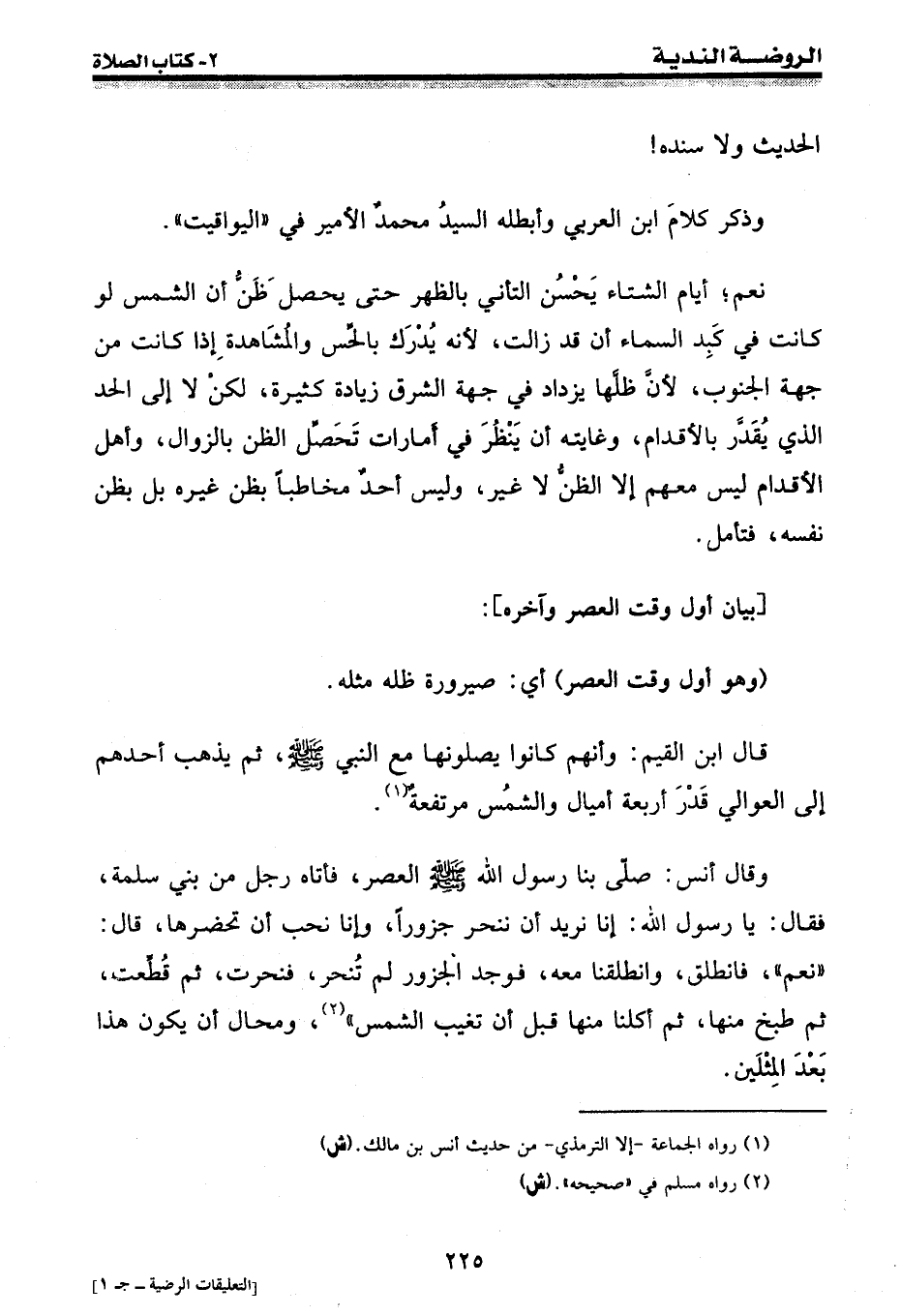وقال أنس: صلى بنا رسول الله [صلى الله عليه وسلم] العصر، فأتاه رجل من بني سلمة، فقال: يا رسول الله: إنا نريد أن ننحر جزوراً، وإنا نحب أن تحضرها، قال: " نعم "، فانطلق، وانطلقنا معه، فوجد الجزور لم تُنحر، فنحرت، ثم قطعت، ثم طبخ منها، ثم أكلنا منها قبل أن تغيب الشمس " (¬2) ، ومحال أن يكون هذا بعد المثلين.