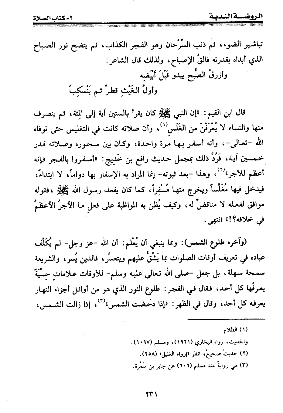 قال ابن القيم: " إن النبي [صلى الله عليه وسلم] كان يقرأ بالستين آية إلى المئة، ثم ينصرف منها والنساء لا يُعرفن من الغلس (¬1) ، وأن صلاته كانت في التغليس حتى توفاه الله - تعالى -، وأنه أسفر بها مرة واحدة، وكان بين سحوره وصلاته قدر خمسين آية، فرُد ذلك بمجمل حديث رافع بن خديج: " أسفروا بالفجر فإنه أعظم للأجر " (¬2) ، وهذا - بعد ثبوته - إنما المراد به الإسفار بها دواماً، لا ابتداء، فيدخل فيها مغلسا ويخرج منها مسفرا، كما كان يفعله رسول الله [صلى الله عليه وسلم] ، فقوله موافق لفعله لا مناقض له، وكيف يُظن به المواظبة على فعل ما الأجر الأعظم في خلافه؟ ! " انتهى.