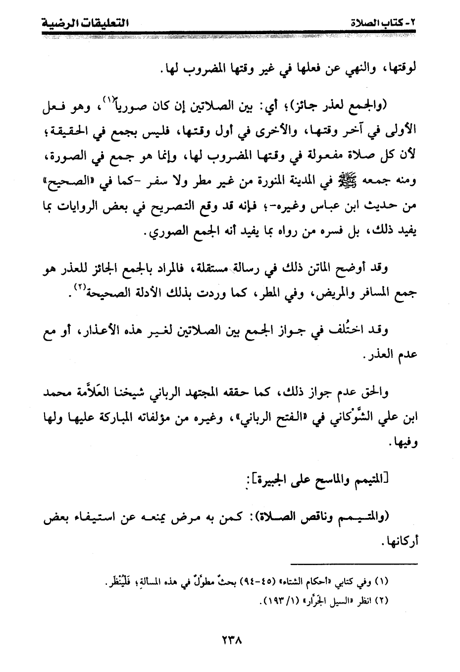 وقد أوضح الماتن ذلك في رسالة مستقلة، فالمراد بالجمع الجائز للعذر هو جمع المسافر والمريض، وفي المطر، كما وردت بذلك الأدلة الصحيحة (¬2) .