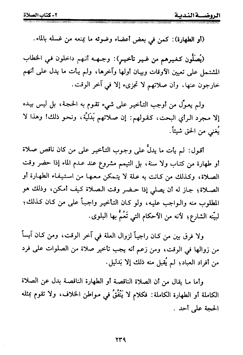أقول: لم يأت ما يدل على وجوب التأخير على من كان ناقص صلاة أو طهارة من كتاب ولا سنة، بل التيمم مشروع عند عدم الماء إذا حضر وقت الصلاة، وكذلك من كانت به علة لا يتمكن معها من استيفاء الطهارة أو الصلاة؛ جاز له أن يصلي إذا حضر وقت الصلاة كيف أمكن، وذلك هو المطلوب منه والواجب عليه، ولو كان التأخير واجباً على من كان كذلك؛ لبينه الشارع؛ لأنه من الأحكام التي تعم بها البلوى.
