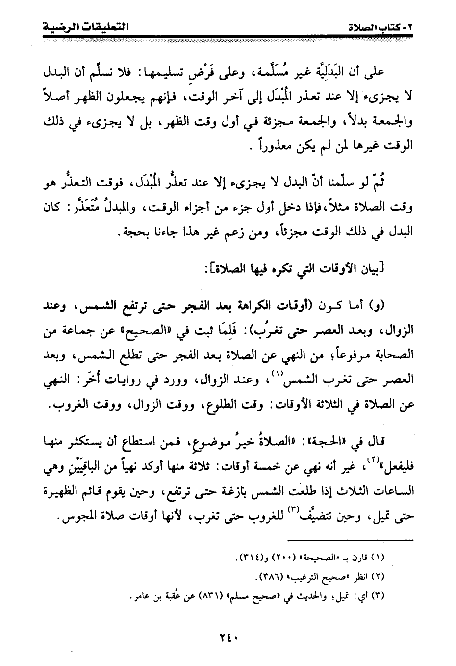 قال في " الحجة ": " الصلاة خير موضوع، فمن استطاع أن يستكثر منها فليفعل " (¬2) ، غير أنه نهي عن خمسة أوقات: ثلاثة منها أوكد نهيا من الباقيين وهي الساعات الثلاث إذا طلعت الشمس بازغة حتى ترتفع، وحين يقوم قائم الظهيرة حتى تميل، وحين تتضيف (¬3) للغروب حتى تغرب، لأنها أوقات صلاة المجوس.
