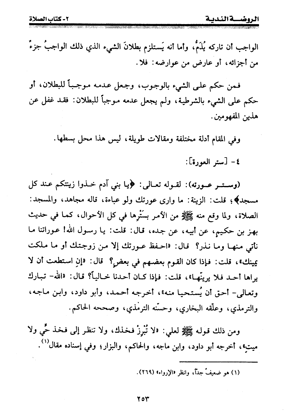 (وستر عورته) : لقوله تعالى: {يا بني آدم خذوا زينتكم عند كل مسجد} ؛ قلت: الزينة: ما وارى عورتك ولو عباءة، قاله مجاهد، والمسجد: الصلاة، ولما وقع منه [صلى الله عليه وسلم] من الأمر بسترها في كل الأحوال، كما في حديث بهز بن حكيم، عن أبيه، عن جده، قال: قلت: يا رسول الله! عوراتنا ما نأتي منها وما نذر؟ قال: " احفظ عورتك إلا من زوجتك أو ما ملكت يمينك "، قلت: فإذا كان القوم بعضهم في بعض؟ قال: " إن استطعت أن لا يراها أحد فلا يرينها "، قلت: فإذا كان أحدنا خالياً؟ قال: " الله - تبارك وتعالى - أحق أن يُستحيا منه "، أخرجه أحمد، وأبو داود، وابن ماجه، والترمذي، وعلقه البخاري، وحسنه الترمذي، وصححه الحاكم.