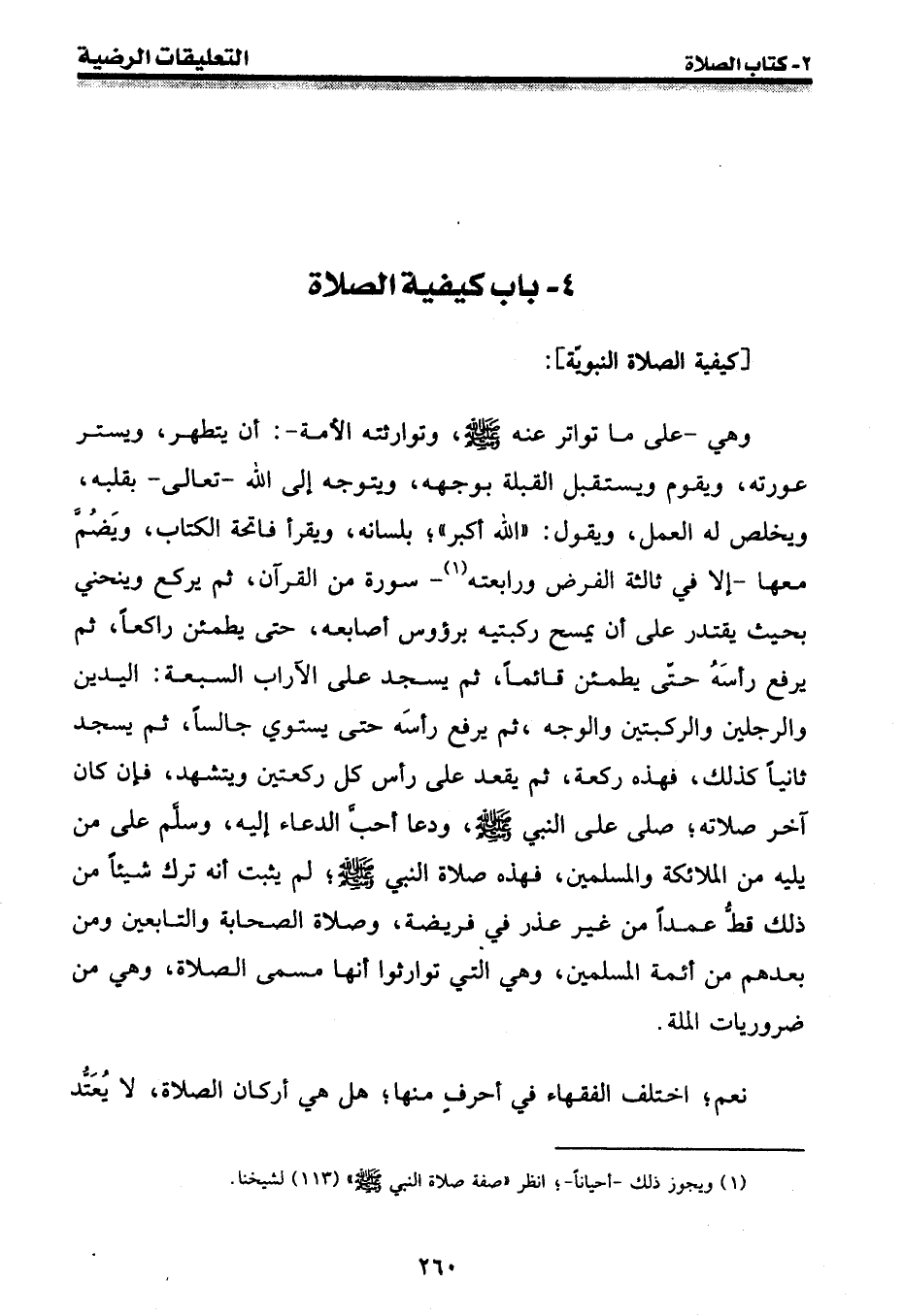 وهي - على ما تواتر عنه [صلى الله عليه وسلم] ، وتوارثته الأمة -: أن يتطهر، ويستر عورته، ويقوم ويستقبل القبلة بوجهه، ويتوجه إلى الله - تعالى - بقلبه، ويخلص له العمل، ويقول: " الله أكبر "؛ بلسانه، ويقرأ فاتحة الكتاب، ويضم معها - إلا في ثالثة الفرض ورابعته (¬1) - سورة من القرآن، ثم يركع وينحني بحيث يقتدر على أن يمسح ركبتيه برؤوس أصابعه، حتى يطمئن راكعاً، ثم يرفع رأسه حتى يطمئن قائماً، ثم يسجد على الآراب السبعة: اليدين والرجلين والركبتين والوجه، ثم يرفع رأسه حتى يستوي جالساً، ثم يسجد ثانيا كذلك، فهذه ركعة، ثم يقعد على رأس كل ركعتين ويتشهد، فإن كان آخر صلاته؛ صلى على النبي [صلى الله عليه وسلم] ، ودعا أحب الدعاء إليه، وسلم على من يليه من الملائكة والمسلمين، فهذه صلاة النبي [صلى الله عليه وسلم] ؛ لم يثبت أنه ترك شيئاً من ذلك قط عمداً من غير عذر في فريضة، وصلاة الصحابة والتابعين ومن بعدهم من أئمة المسلمين، وهي التي توارثوا أنها مسمى الصلاة، وهي من ضروريات الملة.