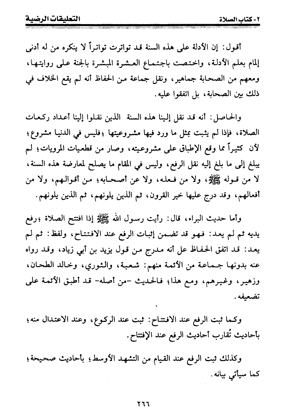 والحاصل: أنه قد نقل إلينا هذه السنة الذين نقلوا إلينا أعداد ركعات الصلاة، فإن لم يثبت بمثل ما ورد فيها مشروعيتها؛ فليس في الدنيا مشروع؛ لأن كثيرا مما وقع الإطباق على مشروعيته، وصار من قطعيات المرويات؛ لم يبلغ ما بلغ إليه نقل الرفع، وليس في المقام ما يصلح لمعارضة هذه السنة، لا من قوله [صلى الله عليه وسلم] ، ولا من فعله، ولا عن أصحابه؛ من أقوالهم، ولا من أفعالهم، وقد درج عليها خير القرون، ثم الذين يلونهم، ثم الذين يلونهم.