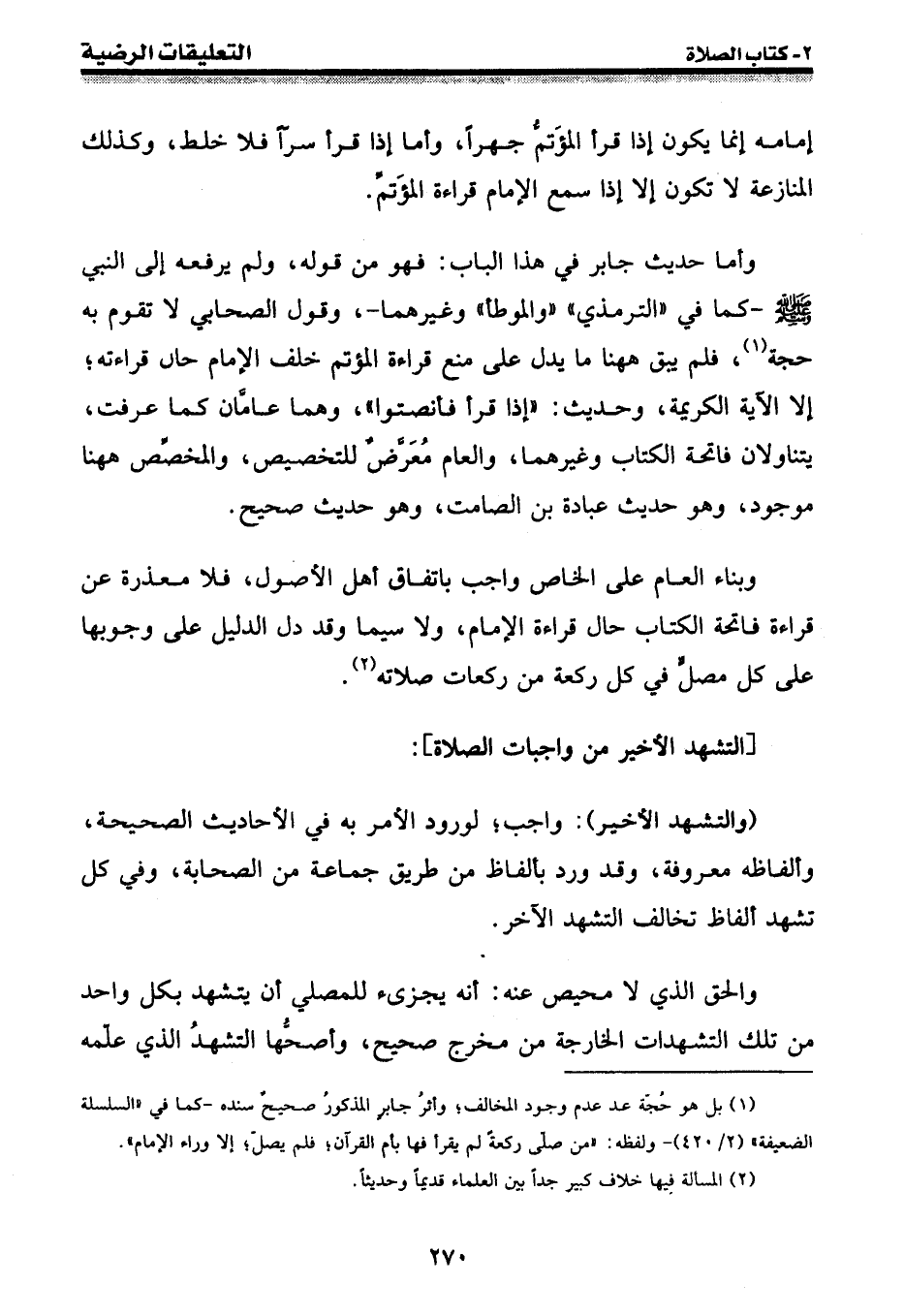 (¬1) بل هو حجة عدم وجود المخالف؛ وأثر جابر المذكور صحيح سنده - كما في " السلسلة الضعيفة " (2 / 420) - ولفظه: " من صلى ركعة لم يقرأ فيها بأم القرآن، فلم يصل؛ إلا وراء الإمام ".