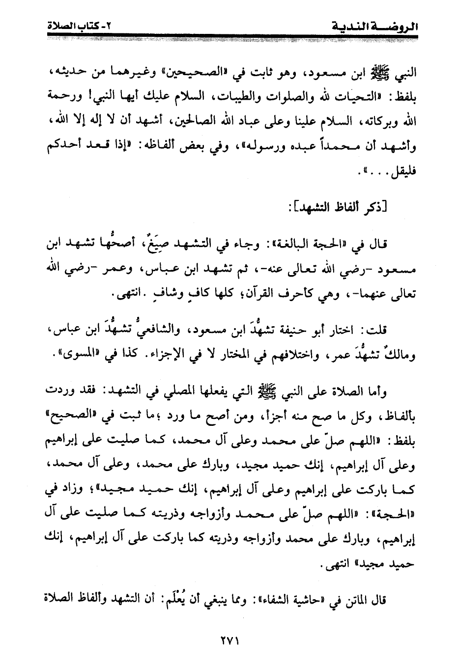 قال في " الحجة البالغة ": وجاء في التشهد صيغ، أصحها تشهد ابن مسعود - رضي الله تعالى عنه -، ثم تشهد ابن عباس، وعمر - رضي الله تعالى عنهما - وهي كأحرف القرآن؛ كلها كاف وشاف. انتهى.