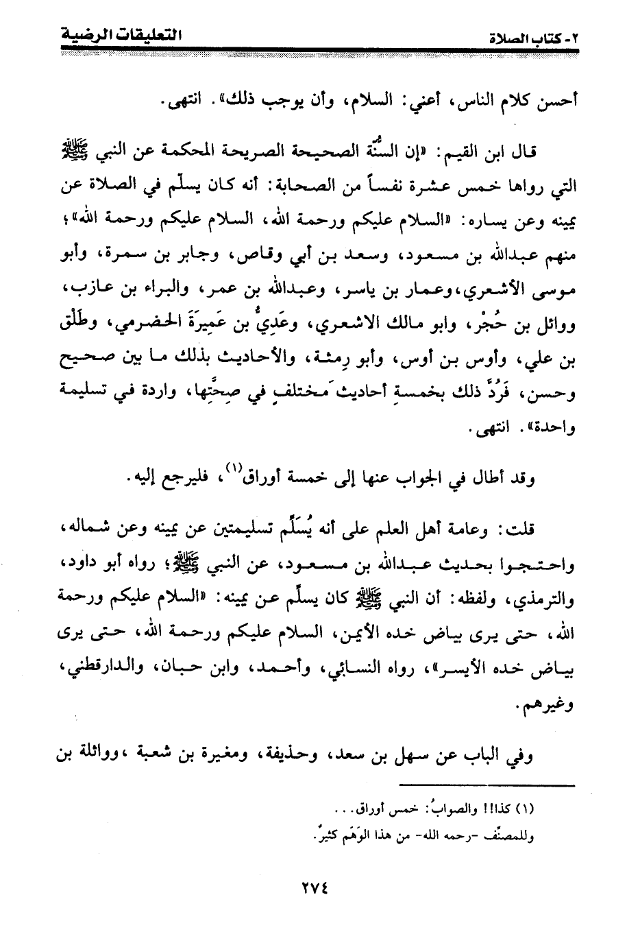 قال ابن القيم: " إن السنة الصحيحة الصريحة المحكمة عن النبي [صلى الله عليه وسلم] التي رواها خمس عشرة نفسا من الصحابة: أنه كان يسلم في الصلاة عن يمينه وعن يساره: " السلام عليكم ورحمة الله، السلام عليكم ورحمة الله "؛ منهم عبد الله بن مسعود، وسعد بن أبي وقاص، وجابر بن سمرة، وأبو موسى الأشعري، وعمار بن ياسر، وعبد الله بن عمر، والبراء بن عازب، ووائل بن حجر، وأبو مالك الأشعري، وعدي بن عميرة الحضرمي، وطلق بن علي، وأوس بن أوس، وأبو رمثة، والأحاديث بذلك ما بين صحيح وحسن، فرد ذلك بخمسة أحاديث مختلف في صحتها، واردة في تسليمة واحدة ". انتهى.