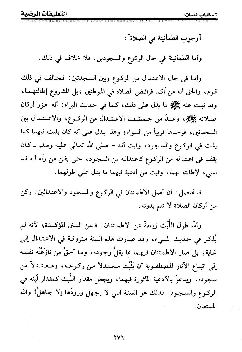 وأما طول اللبث زيادة عن الاطمئنان: فمن السنن المؤكدة؛ لأنه لم يذكر في حديث المسيء، وقد صارت هذه السنة متروكة في الاعتدال إلى غاية؛ بل صار الاطمئنان فيهما مما يقل وجوده، وما أحق من نازعته نفسه إلى اتباع الآثار المصطفوية أن يثبت معتدلا من ركوعه، ومعتدلا من سجوده، ويدعو بالأدعية المأثورة فيهما، ويجعل مقدار اللبث كمقدار لبثه في الركوع والسجود {فذلك هو السنة التي لا يجهل ورودها إلا جاهل} والله المستعان.