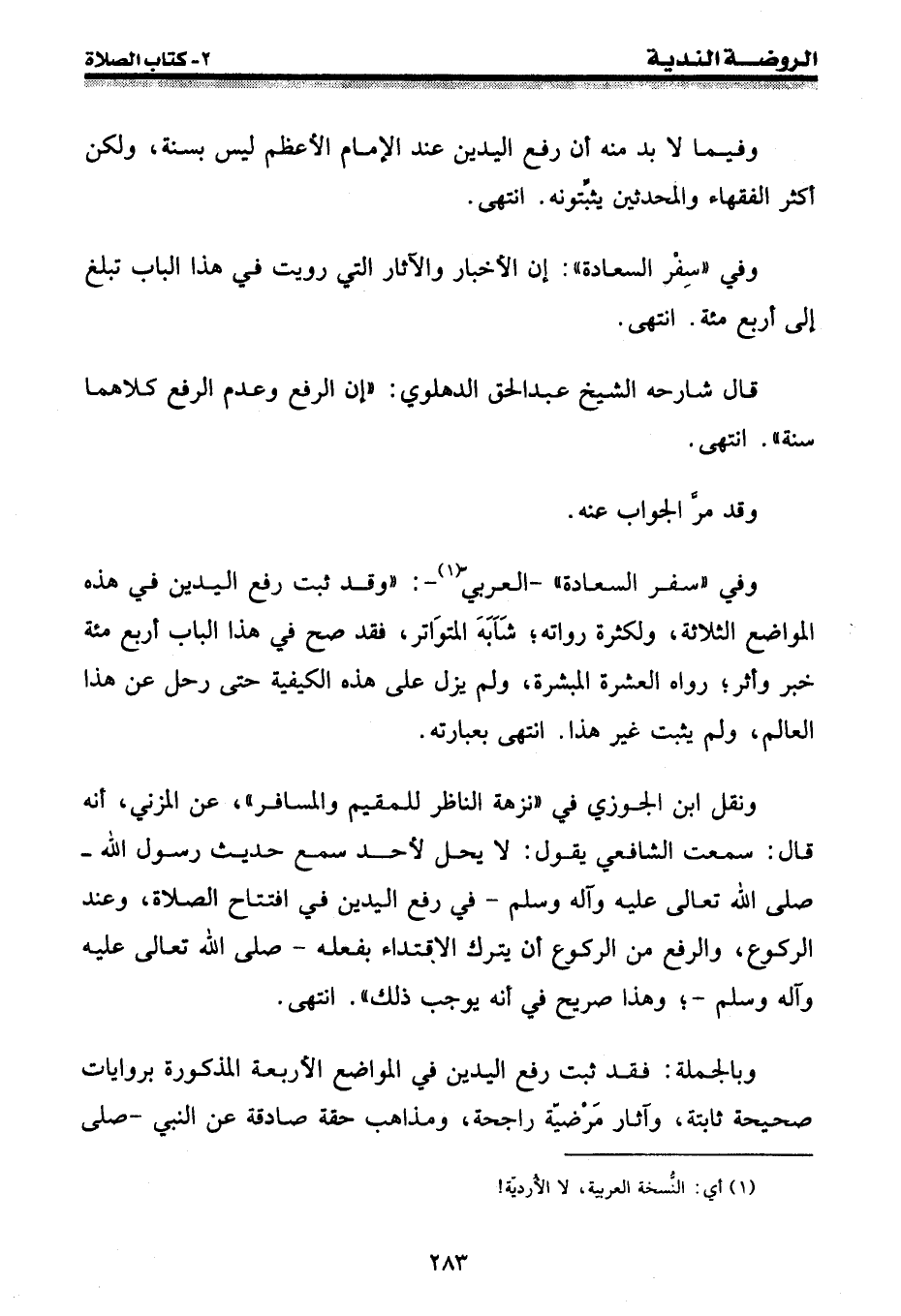 وفي " سفر السعادة " - العربي (¬1) -: " وقد ثبت رفع اليدين في هذه المواضع الثلاثة، ولكثرة رواته؛ شابه المتواتر، فقد صح في هذا الباب أربع مئة خبر وأثر؛ رواه العشرة المبشرة، ولم يزل على هذه الكيفية حتى رحل عن هذا العالم، ولم يثبت غير هذا. انتهى بعبارته.