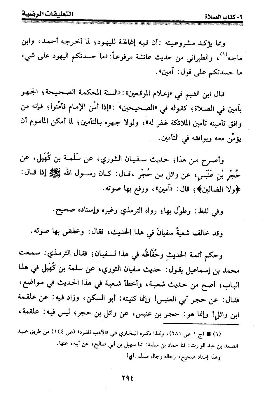 وأصرح من هذا؛ حديث سفيان الثوري، عن سلمة بن كهيل، عن حُجْر بن عنبس، عن وائل بن حجر، قال: كان رسول الله [صلى الله عليه وسلم] إذا قال: {ولا الضالين} ؛ قال: " آمين "، ورفع بها صوته.