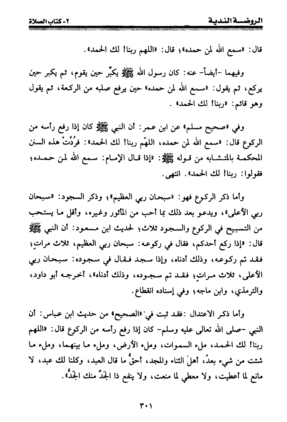 وأما ذكر الاعتدال: فقد ثبت في " الصحيح " من حديث ابن عباس: أن النبي -[صلى الله عليه وسلم]- كان إذا رفع رأسه من الركوع قال: " اللهم ربنا! لك الحمد، ملء السموات وملء الأرض، وملء ما بينهما، وملء ما شئت من شيء بعد، أهل الثناء والمجد، أحق ما قال العبد، وكلنا لك عبد، لا مانع لما أعطيت، ولا معطي لما منعت، ولا ينفع ذا الجد منك الجد ".